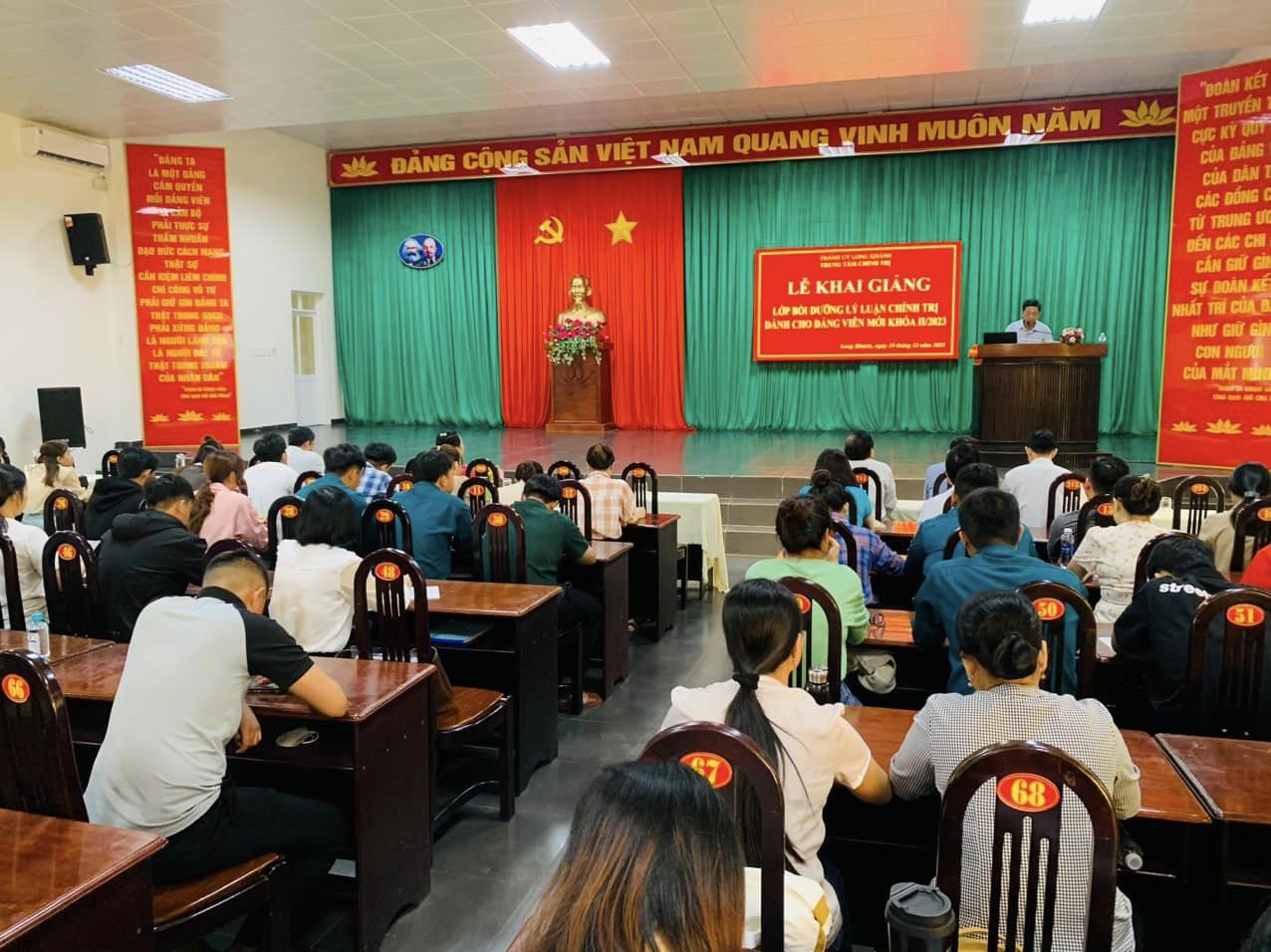Sáng ngày 25/12/2023, tại Trung tâm Chính trị thành phố Long Khánh đã diễn ra lễ khai giảng lớp bồi dưỡng LLCT dành cho đảng viên mới (khóa II) năm 2023, với sự tham dự của 95 học viên. Dự lễ khai giảng có đồng chí Phan Nguyễn Đoan Hạnh - Thành ủy viên, Phó Trưởng ban Ban Tuyên Thành ủy; đồng chí Hồ Cố Giả - Phó Giám đốc Trung tâm Chính trị thành phố; Lãnh đạo các Ban Đảng, Văn phòng Thành ủy; đại diện Đảng ủy Công an thành phố, Bệnh viện ĐKKV Long Khánh; Đại diện Đảng ủy của 15 xã, phường; Chi bộ đơn vị: Ban quản lý dự án, Trường THPT Hoàng Diệu có đảng viên dự học.