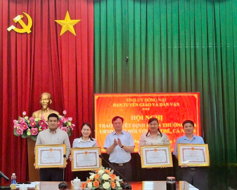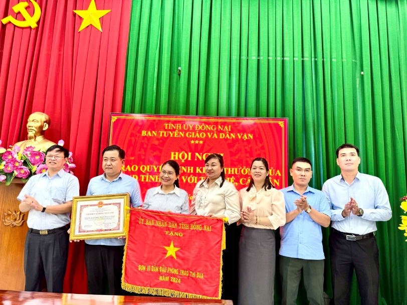 Tại Hội nghị, Ban Tuyên giáo và Dân vận Tỉnh ủy đã trao quyết định khen thưởng của Chủ tịch UBND tỉnh cho các tập thể, cá nhân thuộc Ban Tuyên giáo Tỉnh ủy và Ban Dân vận Tỉnh ủy (nay là Ban Tuyên giáo và Dân vận Tỉnh ủy) đã có thành tích xuất sắc trong phong trào thi đua yêu nước năm 2024: (1) Về tập thể: Tặng danh hiệu Cờ Thi đua, danh hiệu tập thể Lao động xuất sắc, Bằng khen cho tập thể Phòng Tuyên truyền, Báo chí - Xuất bản và Phòng Dân vận chính quyền các cơ quan nhà nước, dân tộc tôn giáo. (2) Về cá nhân: Tặng Bằng khen cho 04 cá nhân thuộc Phòng Dân vận chính quyền các cơ quan nhà nước, dân tộc, tôn giáo; Phòng Đoàn thể và các Hội và Phòng Thông tin - Tổng hợp.
