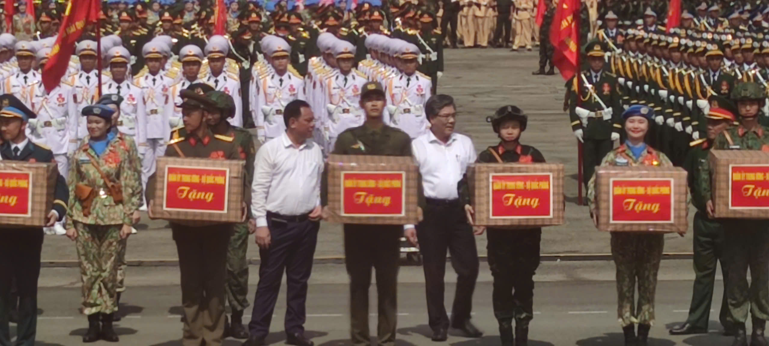 Các đồng chí lãnh đạo tỉnh tặng quà lực lượng tham gia nhiệm vụ diễu binh, diễu hành