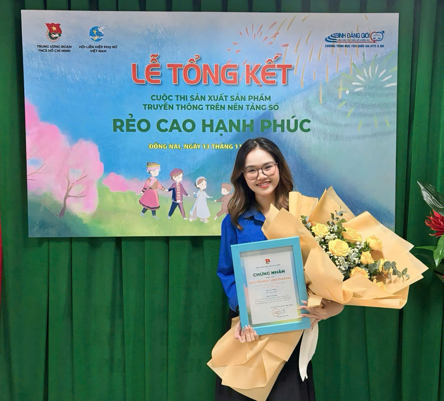 Sáng ngày 13/11/2024, Ban Bí thư Trung ương Đoàn tổ chức Lễ Tổng kết Cuộc thi sản xuất sản phẩm truyền thông trên nền tảng số “Rẻo cao hạnh phúc” bằng hình thức trực tiếp kết hợp trực tuyến tại 04 điểm cầu ở các đơn vị đạt giải. Tại điểm cầu tỉnh Đồng Nai, chị Nguyễn Trần Phương Hà, Phó Bí thư Tỉnh đoàn đã thay mặt Ban Bí thư Trung ương Đoàn trao giải Nhì cho cô giáo Nguyễn Ngọc Linh Phương, giáo viên trường THCS Lê Quang Định (thành phố Biên Hòa).