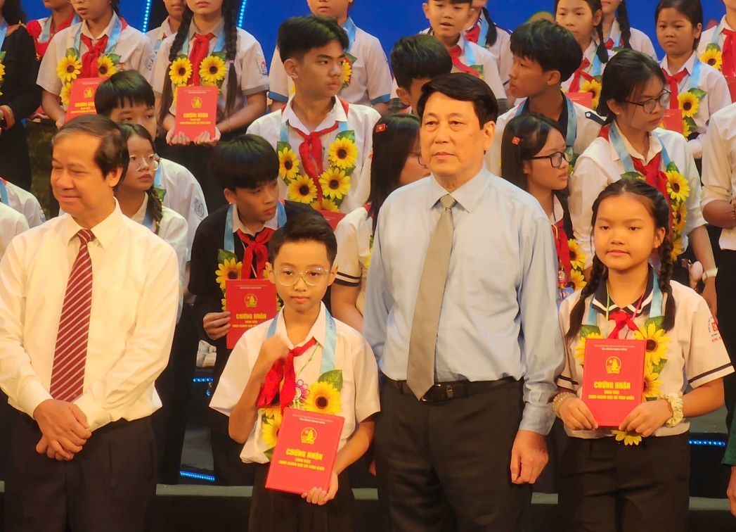 Chủ tịch nước Lương Cường chụp ảnh lưu niệm với 02 đại biểu thiếu nhi tỉnh Đồng Nai