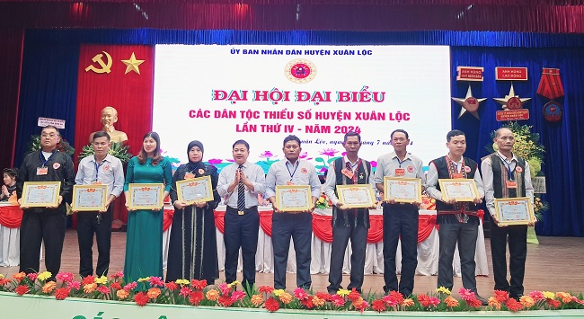 Chị Sou A Tah (thứ 4 từ trái qua) nhận Bằng khen của UBND huyện Xuân Lộc tại Đại hội đại biểu các dân tộc thiểu số huyện Xuân Lộc lần thứ IV năm 2024