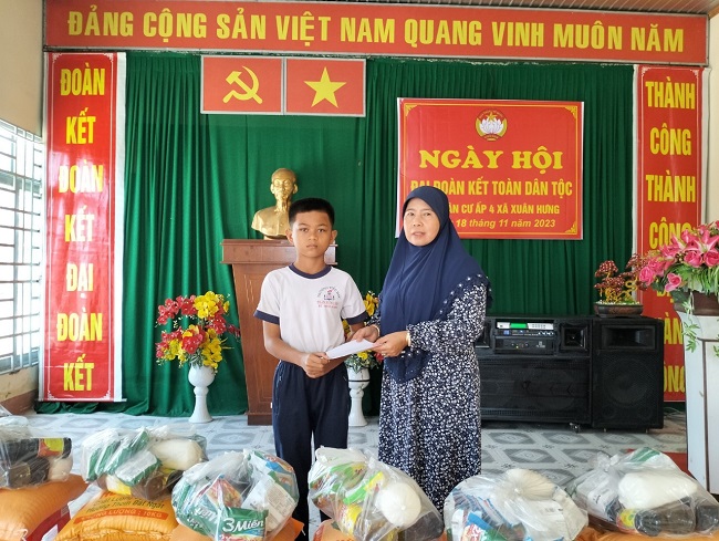 Chị Sou A Tah tham gia Ngày hội Đại đoàn kết toàn dân tộc và hỗ trợ học bổng, nhu yếu phẩm cho phụ nữ, trẻ em tại địa phương