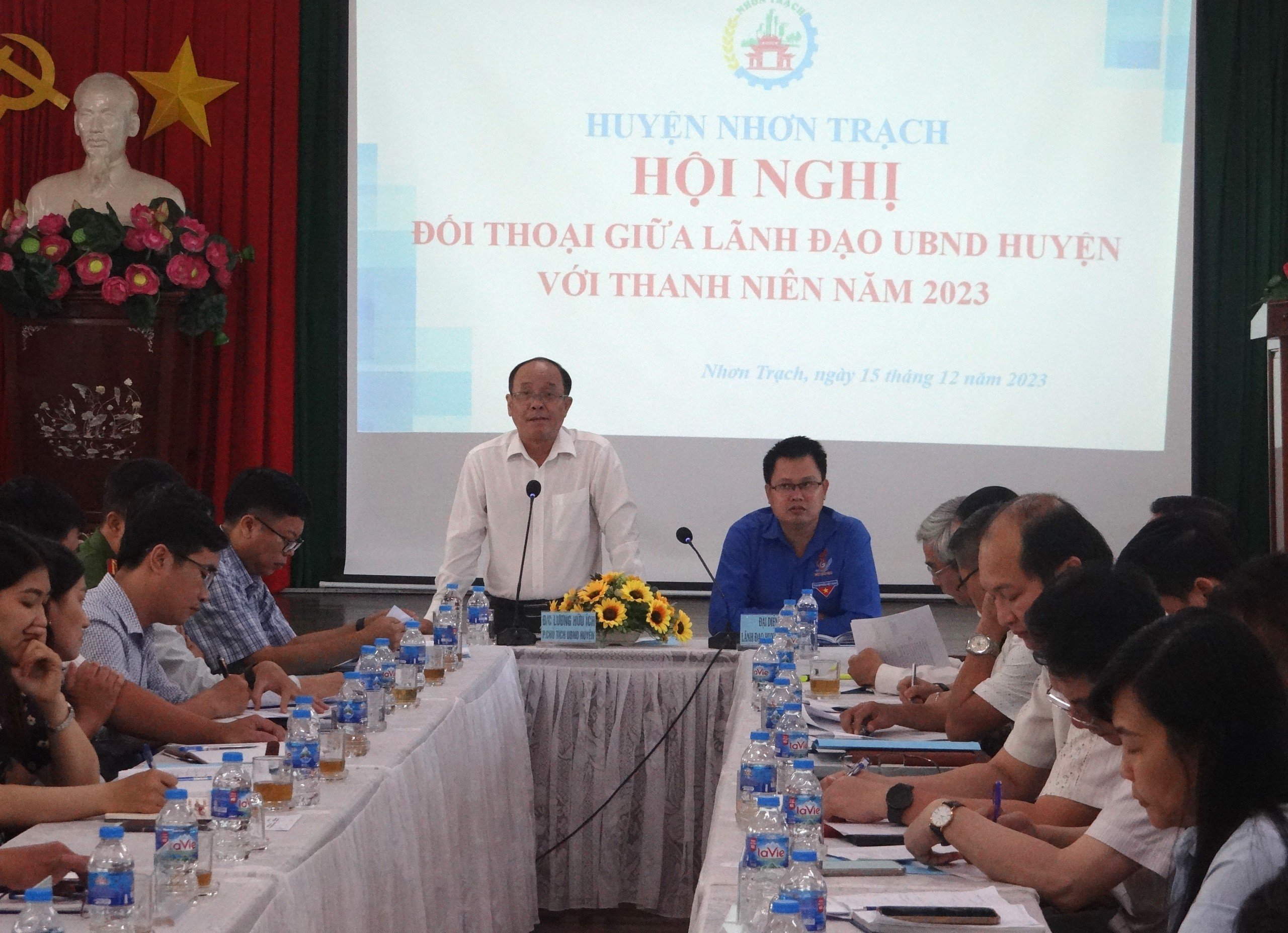 Ngày 15/12/2023, Huyện Nhơn Trạch đã tổ chức Hội nghị đối thoại giữa lãnh đạo UBND huyện với thanh niên năm 2023. Dự và chủ trì hội nghị có đồng chí Lương Hữu Ích - HUV, Phó Chủ tịch UBND huyện Nhơn Trạch và đồng chí Châu Thành Phương - HUV, Bí thư Huyện đoàn Nhơn Trạch.
