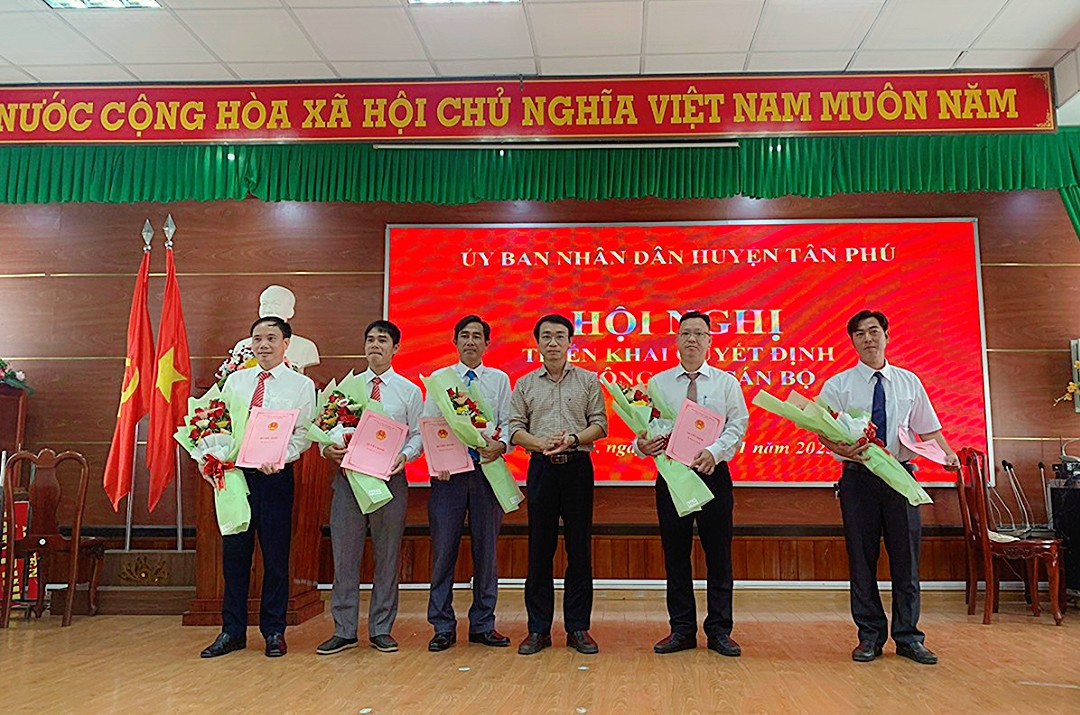 Tại hội nghị, lãnh đạo Phòng Nội vụ huyện đã công bố quyết định của Chủ tịch UBND huyện Tân Phú bổ nhiệm đồng chí Ngô Ngọc Anh - Phó Trưởng Phòng Tài chính - Kế hoạch giữ chức vụ Trưởng Phòng Tài chính - Kế hoạch; bổ nhiệm đồng chí Võ Anh Hùng - Cán bộ Trung tâm Dịch vụ công ích huyện giữ chức vụ Phó Giám đốc Trung tâm Dịch vụ công ích huyện; bổ nhiệm đồng chí Võ Thế Sang - Chuyên viên Phòng Kinh tế và Hạ tầng giữ chức vụ Phó Trưởng Phòng Kinh tế - Hạ tầng. Các đồng chí được bổ nhiệm mới có thời hạn bổ nhiệm là 05 năm, kể từ ngày 10/11/2023. Điều động, bổ nhiệm đồng chí Trần Văn Chinh - Phó Giám đốc Ban Quản lý dự án huyện giữ chức vụ Phó Trưởng Phòng Tài chính - Kế hoạch; điều động, bổ nhiệm đồng chí Lê Minh Trí - Phó Chủ tịch UBND thị trấn Tân Phú giữ chức vụ Phó Trưởng Phòng Tài nguyên và Môi trường. 02 đồng chí được điều động và bổ nhiệm có thời hạn bổ nhiệm là 05 năm, tính từ ngày 14/11/2023.