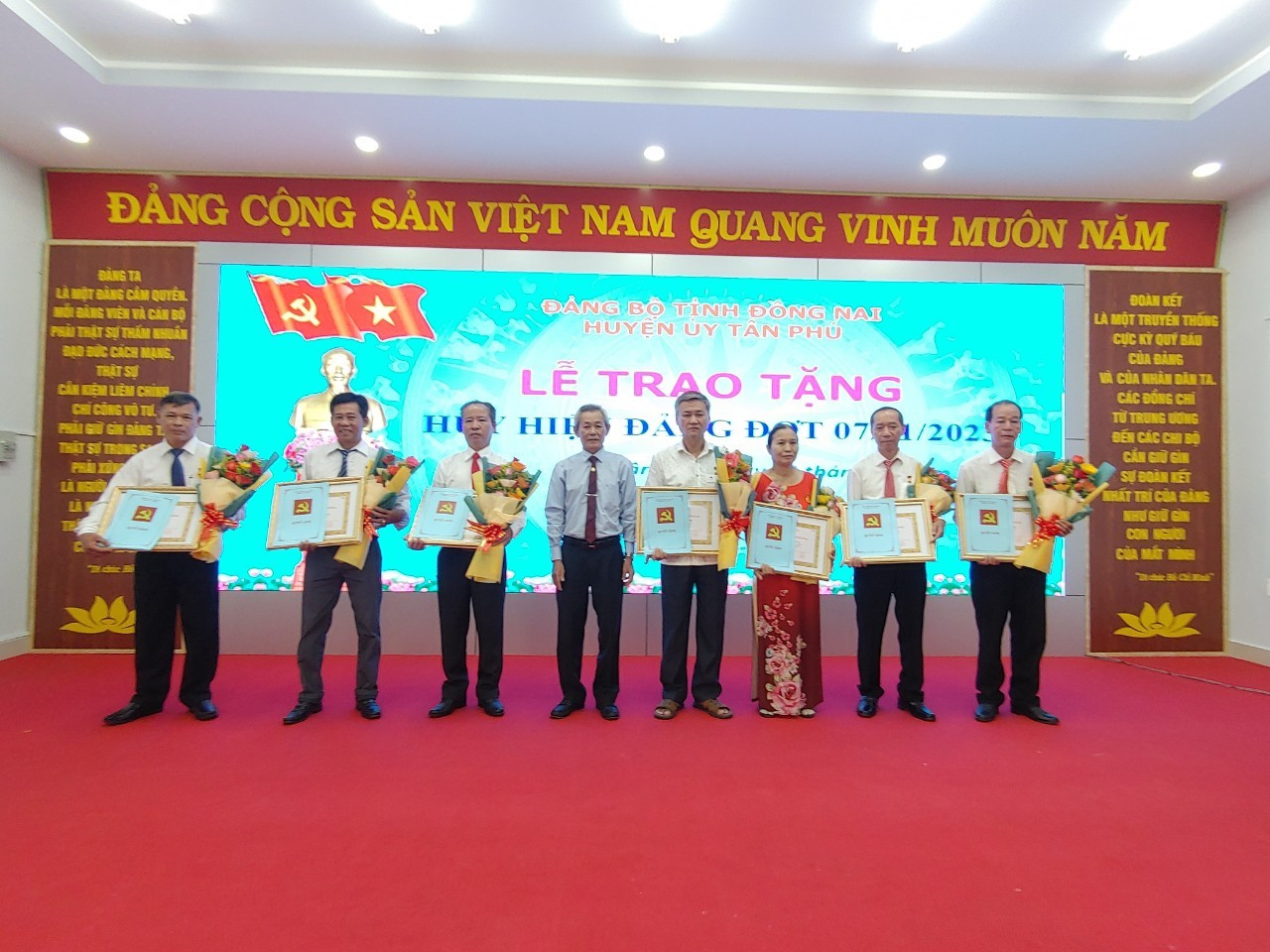 Được biết, sau khi chia tách thành lập huyện Tân Phú theo Quyết định số 107/QĐ-HĐBT, ngày 10/4/1991 của Hội đồng Bộ trưởng (nay là Thủ Tướng Chính phủ), Đảng bộ huyện Tân Phú chỉ có 24 tổ chức cơ sở đảng với 620 đảng viên. Kế thừa sự nghiệp của các lớp đảng viên đi trước, Ban Chấp hành Đảng bộ huyện Tân Phú qua các thời kỳ với quyết tâm chính trị cao trong công tác xây dựng Đảng đã từng bước xây dựng và phát triển Đảng bộ huyện nhà ngày càng lớn mạnh về số lượng và chất lượng. Đến nay, Đảng bộ huyện có 64 chi, đảng bộ cơ sở với 4.431 đảng viên; đảng viên được trao tặng Huy hiệu Đảng có 438 đồng chí (Huy hiệu 30 năm tuổi đảng có 158 đồng chí; 40 năm tuổi đảng có 89 đồng chí; 45 năm tuổi đảng có 54 đồng chí; 50 tuổi đảng 63 có đồng chí; 55 tuổi đảng có 65 đồng chí; 60 tuổi đảng có 14 đồng chí; 70 năm tuổi đảng có 02 đồng chí; 75 năm tuổi đảng có 02 đồng chí).