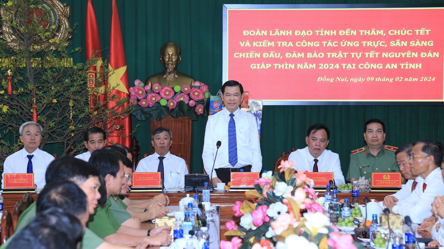 Tại buổi thăm, chúc Tết CB,CS Công an tỉnh Đồng Nai, đồng chí Bí thư Tỉnh ủy nhấn mạnh, để bảo đảm ANTT trên địa bàn, nhất là trong dịp trước, trong và sau Tết Nguyên đán Giáp Thìn 2024, Công an tỉnh cần tập trung nắm, kiểm soát chặt chẽ tình hình, kịp thời phát hiện, đấu tranh, ngăn chặn làm thất bại âm mưu, hoạt động chống phá của các thế lực thù địch, phản động; bảo vệ an toàn các mục tiêu, công trình trọng điểm; các đoàn lãnh đạo Đảng, Nhà nước đến thăm, làm việc, chúc Tết trên địa bàn; huy động lực lượng, phương tiện, sử dụng đồng bộ các biện pháp nghiệp vụ, kiên quyết tấn công các loại tội phạm; tăng cường các biện bảo đảm tốt trật tự an toàn giao thông, trật tự công cộng, phòng cháy, chữa cháy; nhất là tại các điểm bắn pháo hoa, lễ hội, nơi tham quan, du lịch, khu vui chơi, giải trí, bảo đảm cho Nhân dân vui Xuân, đón Tết an toàn, lành mạnh và bình yên.