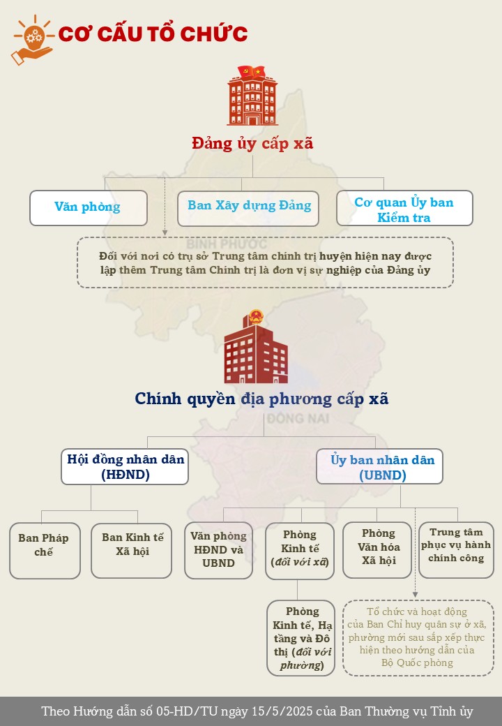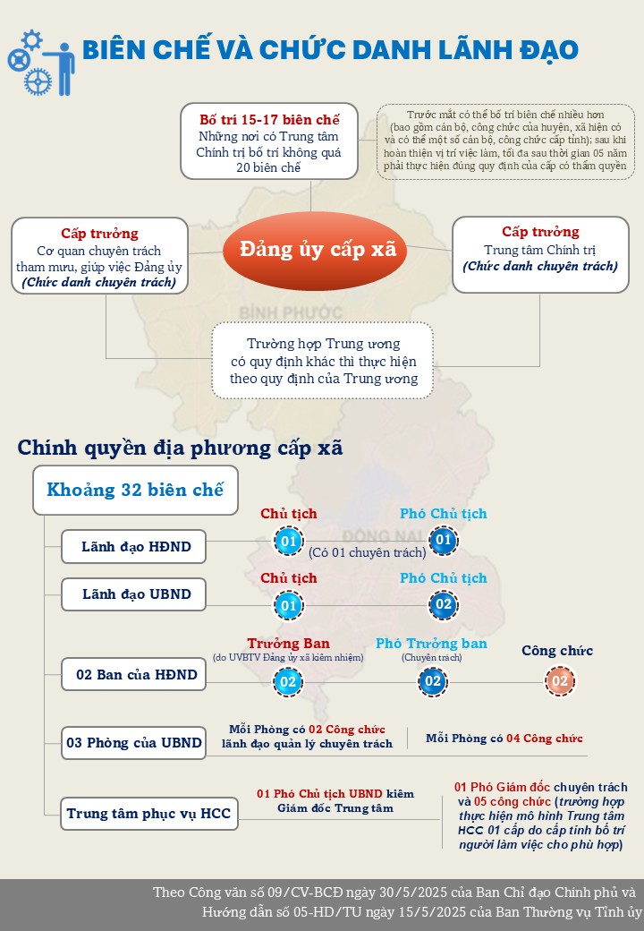 Ngày 15/5/2025, Ban Thường vụ Tỉnh ủy ban hành Hướng dẫn số 05-HD/TU về “cơ cấu tổ chức bộ máy và sắp xếp, bố trí cán bộ, công chức, viên chức, người hoạt động không chuyên trách cấp xã và xây dựng phương án nhân sự cấp ủy cấp xã sau khi sáp nhập, thành lập mới”; Công văn số 9998-CV/TU ngày 06/6/2025 về điều chỉnh, bổ sung Hướng dẫn số 05-HD/TU ngày 15/5/2025 của Ban Thường vụ Tỉnh ủy.
