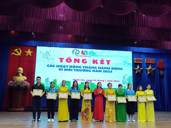 Để cán bộ, hội viên, phụ nữ có thêm động lực trong thi đua thực hiện nhiệm vụ tuyên truyền và tham gia các hoạt động bảo vệ môi trường tại đơn vị. Hội LHPN huyện phối hợp với Phòng Tài nguyên và Môi trường huyện tổ chức tổng kết tháng hành động về môi trường năm 2024 và tổ chức cuộc thi “Rung chuông vàng tìm hiểu về môi trường”, cuộc thi “Thuyết trình về Môi trường” dành cho cán bộ, hội viên Hội LHPN các xã, thị trấn và cán bộ nhân viên công ty Dona Standard trên địa bàn huyện tham gia. Cuộc thi ”Rung chuông vàng tìm hiểu về Môi trường” có 48 thí sinh tham gia. Trải qua nhiều câu hỏi về kiến thức cần thiết trong BVMT, thí sinh Trần Thị Hiền Lương - xã Suối Cao đã đạt giải Nhất cuộc thi. Cuộc thi “Thuyết trình về môi trường” có 16 đội tham gia với gần 150 thí sinh. Kết quả, Ban tổ chức đã trao 1 giải nhất cho Hội LHPN xã Lang Minh, 02 giải nhì cho Hội LHPN xã Xuân Thành và Hội LHPN xã Xuân Hoà. Đồng thời, Phòng Tài nguyên và Môi trường đã trao giấy chứng nhận cho Hội LHPN 15 xã, thị trấn thực hiện tốt công tác phối hợp phân loại chất thải rắn tại nguồn. Tổng trị giá tiền thưởng cho các cuộc thi là 16,4 triệu đồng.