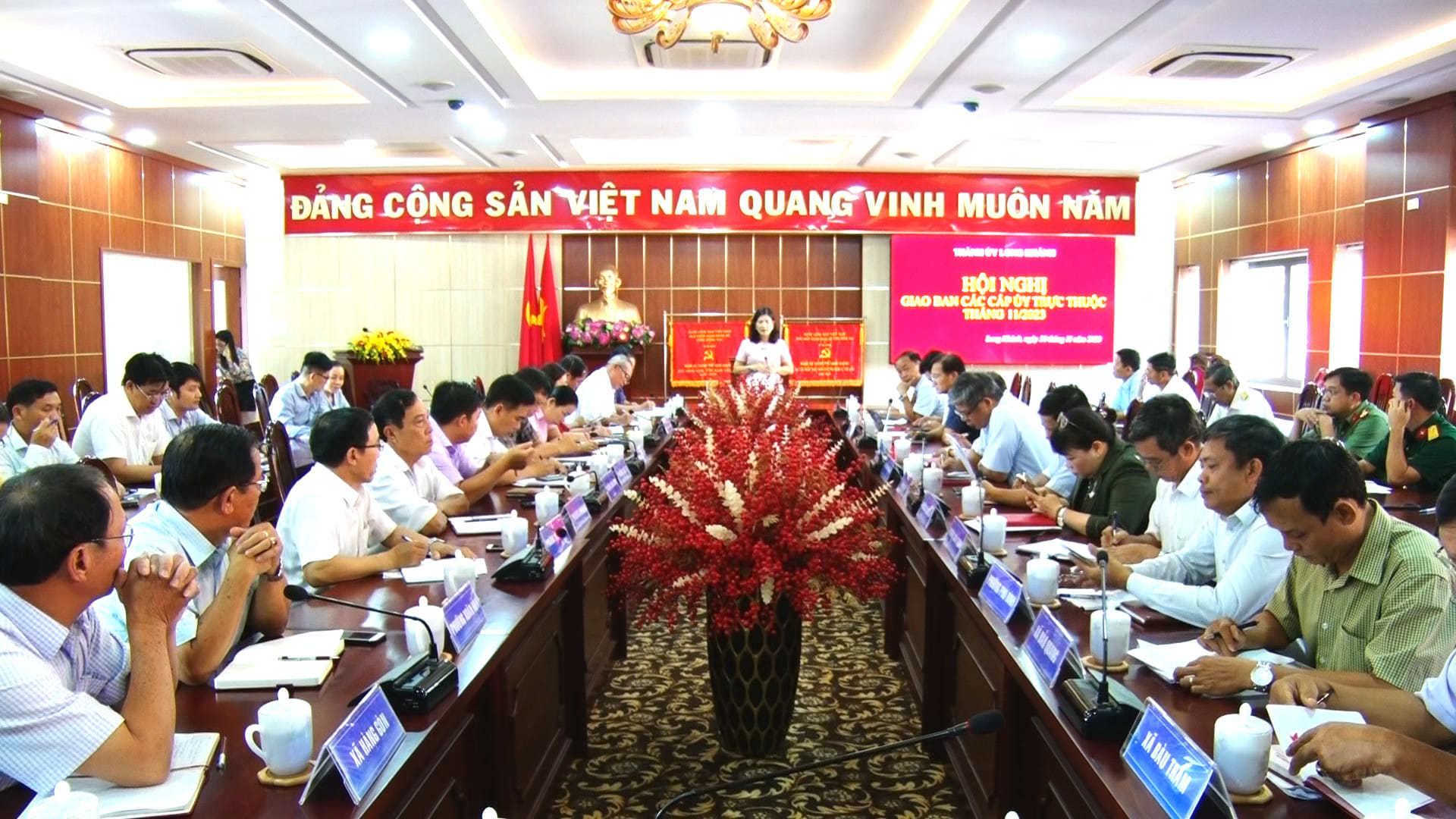 Chiều 30/11, Thành ủy Long Khánh tổ chức Hội nghị giao ban cấp ủy trực thuộc tháng 11/2023, tại Hội trường Thành ủy. Đồng chí Nguyễn Bích Thủy - Phó Bí thư Thường trực Thành ủy chủ trì hội nghị; cùng dự có các đồng chí trong Ban Thường vụ Thành ủy; lãnh đạo cấp ủy các ban, ngành, tổ chức chính trị - xã hội thành phố; lãnh đạo cấp ủy các phường, xã. Tại hội nghị, các đại biểu tập trung thảo luận các nội dung như: Công tác chuẩn bị hồ sơ minh chứng trình tỉnh thẩm định, công nhận xã nông thôn mới kiểu mẫu, khu dân cư kiểu mẫu năm 2023 tại xã Hàng Gòn và xã Bàu Trâm. Đánh giá tiến độ công tác thu - chi ngân sách đến thời điểm hiện nay; các giải pháp chống thất thu thuế và khai thác các nguồn thu trong năm 2023. Việc triển khai các công trình xây dựng cơ bản, nhất là công trình trọng điểm; tiến độ giải ngân vốn đầu tư công. Công tác quản lý đất đai, trật tự xây dựng, trật tự đô thị, quản lý môi trường, thực hiện có hiệu quả công tác giảm nghèo, công tác đào tạo nghề, giải quyết việc làm trên địa bàn. Tình hình an ninh chính trị, trật tự an toàn xã hội, tai nạn giao thông trên địa bàn. Công tác chuẩn bị tuyển quân năm 2024. Công tác tiếp công dân, xử lý, giải quyết đơn thư khiếu nại, tố cáo, phản ánh, kiến nghị. Kết quả xử lý tin báo, tố giác tội phạm và kiến nghị khởi tố vụ án hình sự thời gian qua. Kết quả thực hiện mô hình Bí thư Chi bộ đồng thời là trưởng ấp, khu phố; Bí thư Chi bộ đồng thời là trưởng Ban công tác Mặt trận ấp, khu phố. Tiến độ thực hiện công tác kết nạp đảng viên mới; công tác tạo nguồn, kết nạp đảng năm 2024; các cuộc kiểm tra, giám sát chuyên đề theo Chương trình kiểm tra, giám sát năm 2023.