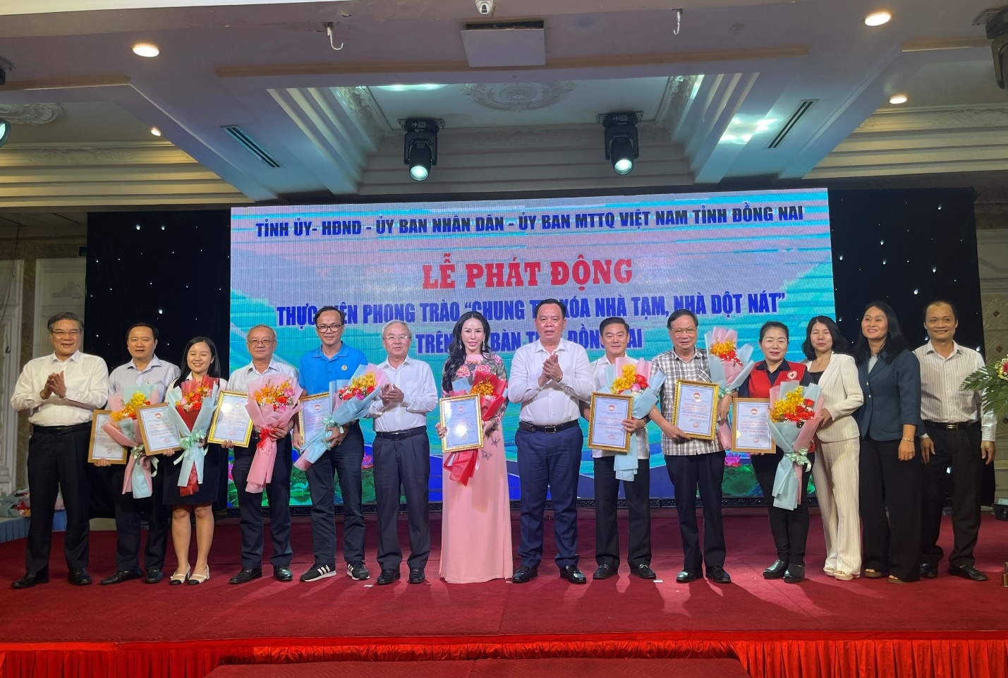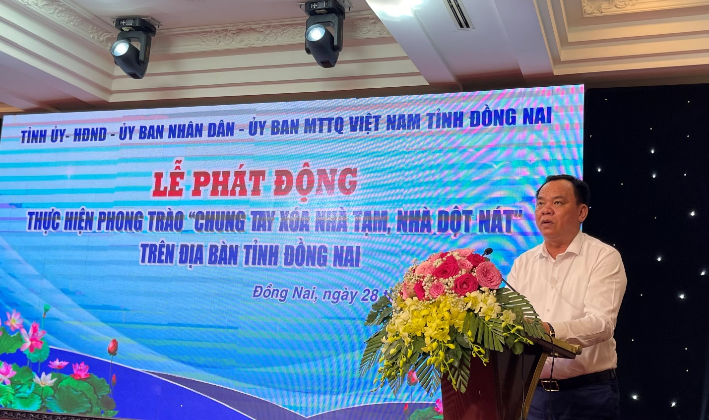 Chiều ngày 28/3/2025, Tỉnh ủy, HĐND, UBND, Ủy ban MTTQ Việt Nam tỉnh Đồng Nai đã tổ chức Lễ phát động thực hiện phong trào “Chung tay xóa nhà tạm, nhà dột nát” trên địa bàn tỉnh. Tham dự lễ phát động có các đồng chí: Võ Tấn Đức, Phó Bí thư Tỉnh ủy, Chủ tịch UBND tỉnh; Cao Văn Quang, Ủy viên Ban Thường vụ Tỉnh ủy, Chủ tịch Ủy ban MTTQ Việt Nam tỉnh; Dương Minh Dũng, Ủy viên Ban Thường vụ Tỉnh ủy, Phó Chủ tịch UBND tỉnh; Hoàng Thị Bích Hằng, Tỉnh ủy viên, Phó Chủ tịch HĐND tỉnh; đại diện lãnh đạo các sở, ban, ngành, các tổ chức chính trị - xã hội tỉnh; đại diện lãnh đạo các huyện, thành phố.
