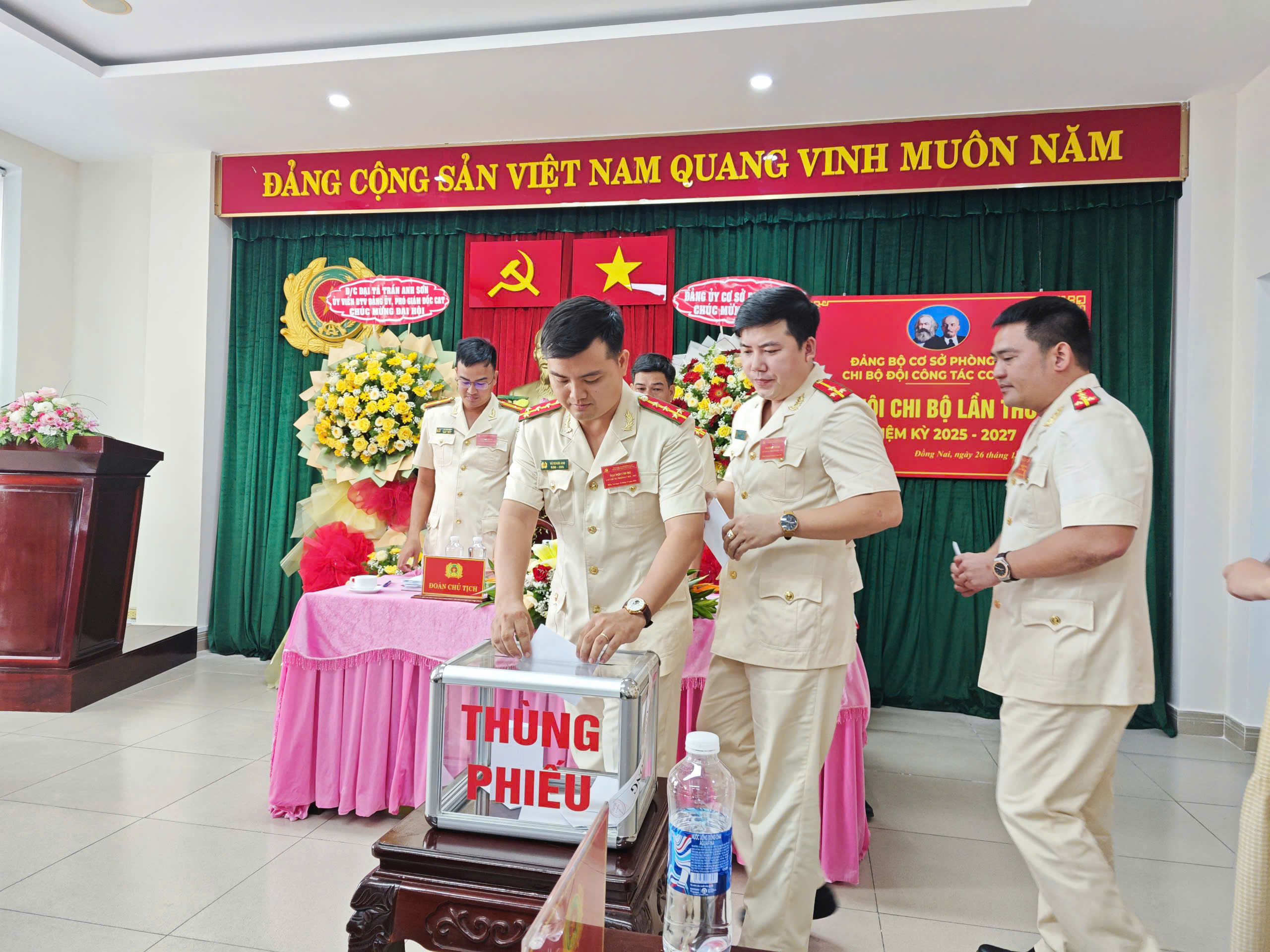 Đại hội đã thực hiện các nội dung kiểm điểm vai trò lãnh đạo của chi ủy nhiệm kỳ 2023-2025; tổng kết thực hiện nghị quyết đại hội chi bộ nhiệm kỳ 2023-2025, xác định mục tiêu, phương hướng, nhiệm vụ của chi bộ nhiệm kỳ 2025-2027; Đại hội cũng đã bầu Cấp ủy Chi bộ nhiệm kỳ 2025-2027 gồm 03 đồng chí, đồng chí Trung tá Bùi Minh Thuấn tiếp tục được Đại hội tín nhiệm bầu giữ chức vụ Bí thư Chi bộ nhiệm kỳ 2025-2027; đồng chí Đỗ Văn Nam tiếp tục tái cử chức vụ Phó Bí thư chi bộ. Sau khi thực hiện bầu cấp ủy, bí thư, phó bí thư chi bộ, Đại hội tiếp tục bầu Đoàn đại biểu tham dự Đại hội đại biểu Đảng bộ cơ sở Phòng Cảnh sát PC,CC và CNCH nhiệm kỳ 2025-2030 gồm 07 đại biểu chính thức và 01 đại biểu dự khuyết.