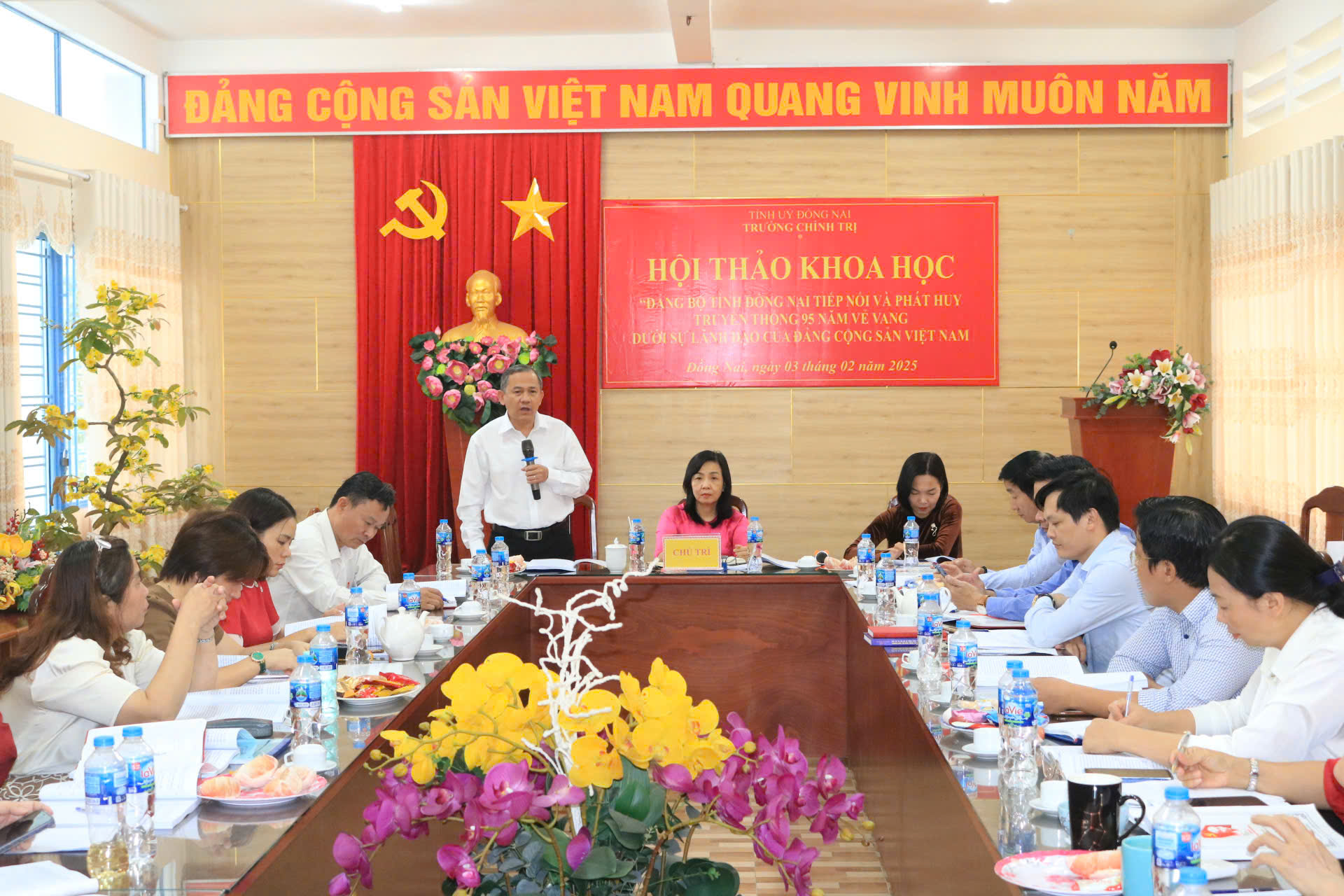 Ngày 03/02/2025, Trường Chính trị tỉnh Đồng Nai tổ chức Hội thảo khoa học nhân kỷ niệm 95 năm Ngày thành lập Đảng Cộng sản Việt Nam (03/02/1930-03/02/2025) với chủ đề: “Đảng bộ tỉnh Đồng Nai tiếp nối và phát huy truyền thống 95 năm vẻ vang dưới sự lãnh đạo của Đảng Cộng sản Việt Nam”. Tham dự và chủ trì hội thảo có: Thạc sĩ Lê Thị Cát Hoa, Hiệu trưởng Trường Chính trị Đồng Nai; Tiến sĩ Vũ Thị Nghĩa, Phó Hiệu trưởng Trường Chính trị Đồng Nai; Thạc sĩ Phạm Tấn Linh, Phó Trưởng ban Ban Tuyên giáo Tỉnh ủy; các phóng viên Báo Đồng Nai, Đài Phát thanh - Truyền hình Đồng Nai; cùng quý thầy, cô là giảng viên Trường Chính trị tỉnh, các nhà nghiên cứu khoa học.