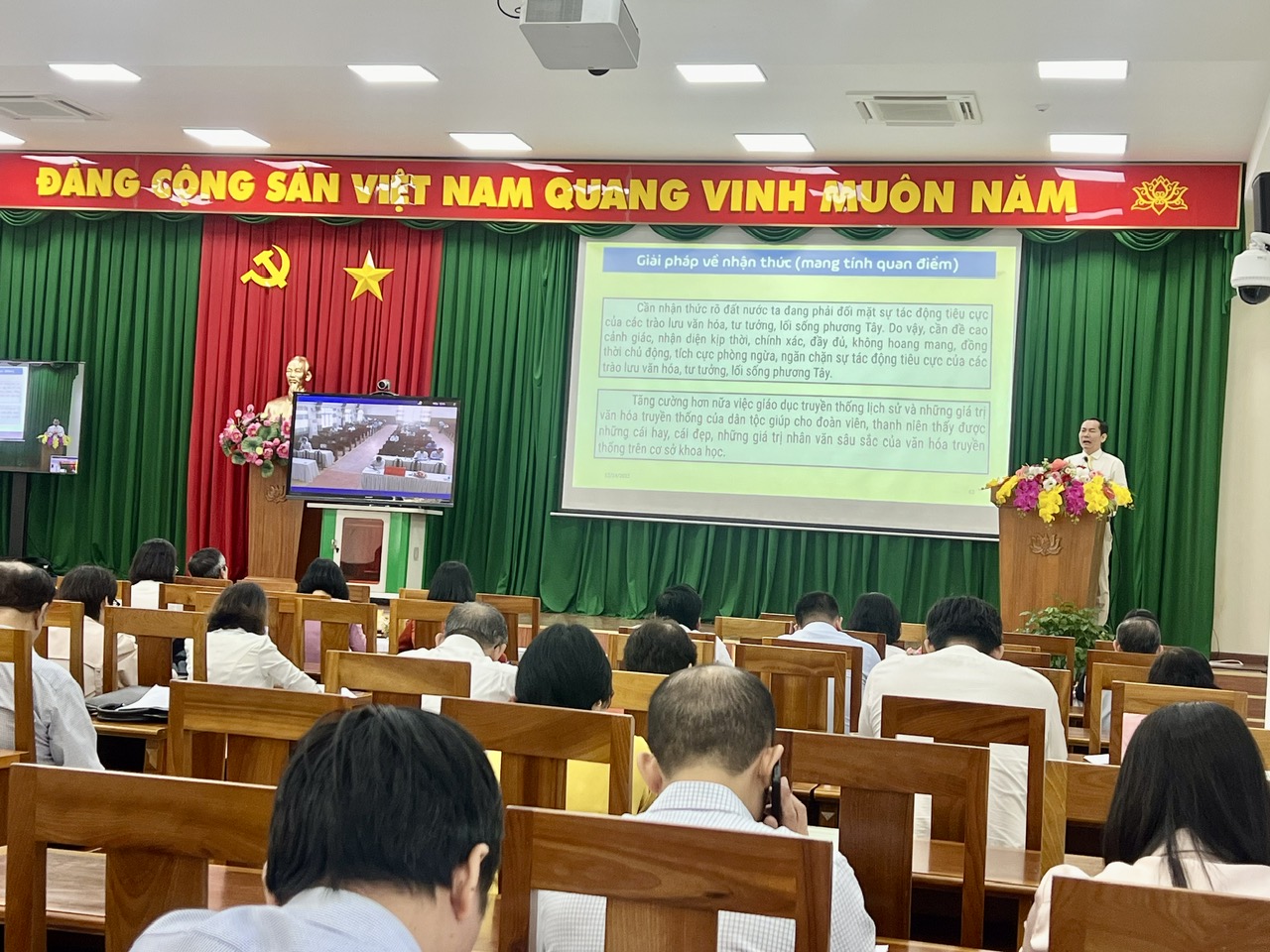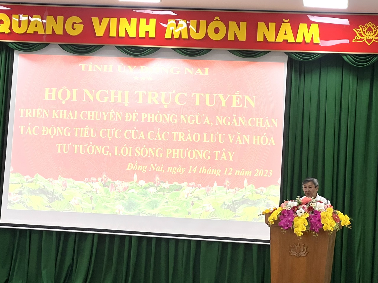 Thực hiện Kế hoạch số 284-KH/TU ngày 25/8/2023 của Ban Thường vụ Tỉnh ủy về tổ chức Hội nghị triển khai chuyên đề phòng ngừa, ngăn chặn tác động tiêu cực của các trào lưu văn hóa tư tưởng, lối sống phương Tây; sáng ngày 14/12/2023 tại Hội trường Tỉnh ủy, Ban Thường vụ Tỉnh ủy đã tổ chức Hội nghị bằng hình thức trực tiếp kết hợp trực tuyến đến 14 điểm cầu các huyện, thành ủy, các đảng ủy trực thuộc, tại Hội nghị đồng chí Đại tá, PGS. TS Hà Trọng Thà, Trưởng khoa An ninh chính trị nội bộ, Đại học An ninh nhân dân báo cáo thông tin chuyên đề về nội dung trên. Điểm cầu Tỉnh ủy đồng chí Hồ Thanh Sơn, Phó Bí thư Thường trực Tỉnh ủy chủ trì. Tham dự có các đồng chí Ủy viên Ban Chấp hành Đảng bộ tỉnh; bí thư các ban cán sự đảng, đảng đoàn; Bí thư, Phó Bí thư Tỉnh đoàn; lãnh đạo Ủy ban Mặt trận Tổ quốc Việt Nam và các tổ chức chính trị - xã hội tỉnh; lãnh đạo các ban đảng và Văn phòng Tỉnh ủy; Ban Biên tập Báo Đồng Nai, lãnh đạo Đài Phát thanh - Truyền hình Đồng Nai; các đồng chí Báo cáo viên Tỉnh ủy; đại biểu Sở Giáo dục và Đào tạo, Liên hiệp các Hội Khoa học và Kỹ thuật tỉnh, Hội Văn học - Nghệ thuật tỉnh, Hội Luật gia...