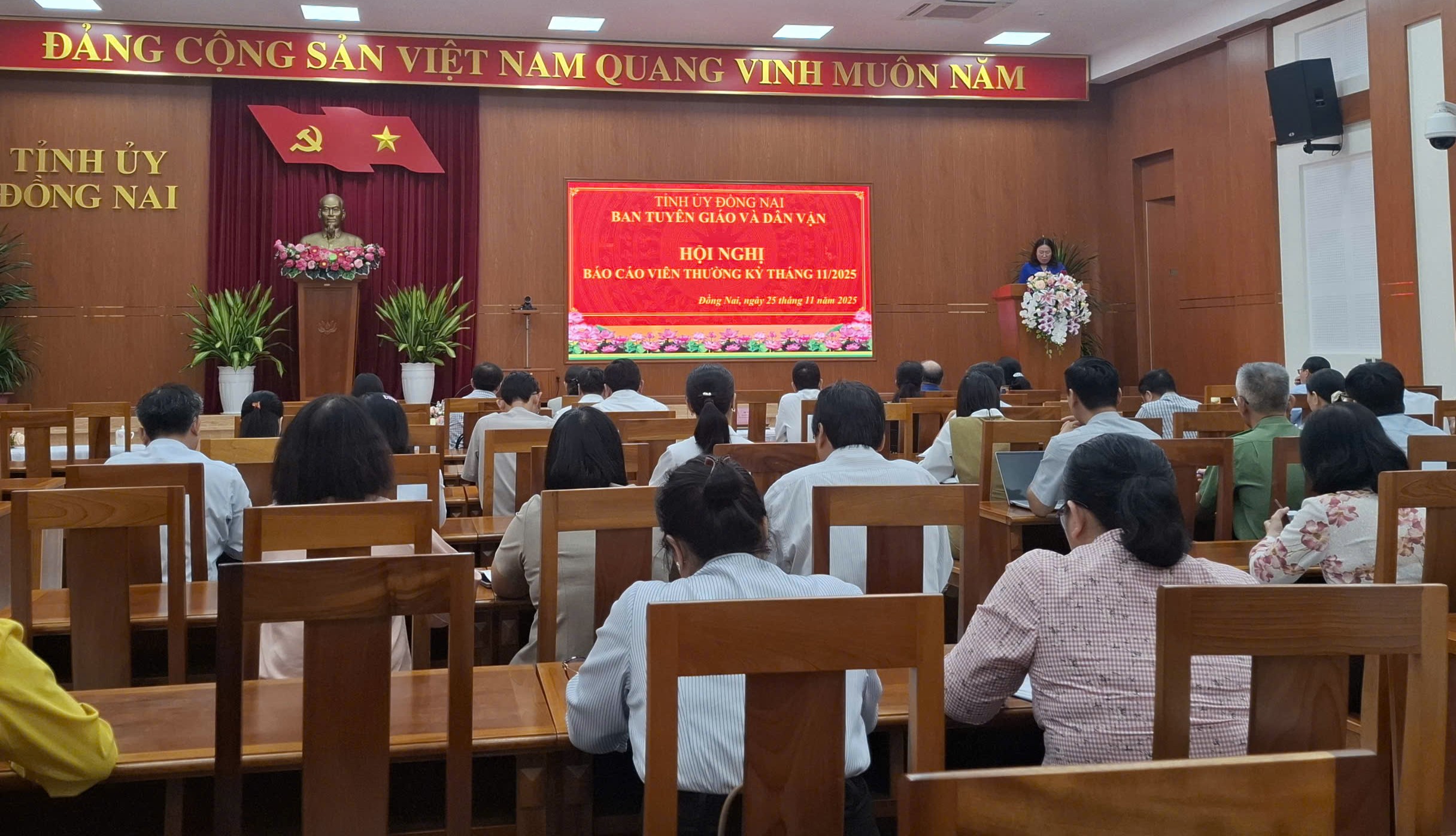 Sáng 25-11-2025, Ban Tuyên giáo và Dân vận Tỉnh ủy Đồng Nai chủ trì tổ chức Hội nghị Báo cáo viên thường kỳ tháng 11-2025. Hội nghị được tổ chức bằng hình thức trực tiếp và kết nối trực tuyến đến 97 điểm cầu trên địa bàn tỉnh, bao gồm: Đảng ủy Công an tỉnh, Đảng ủy Bộ Chỉ huy Quân sự tỉnh và 95 Đảng ủy các xã, phường.