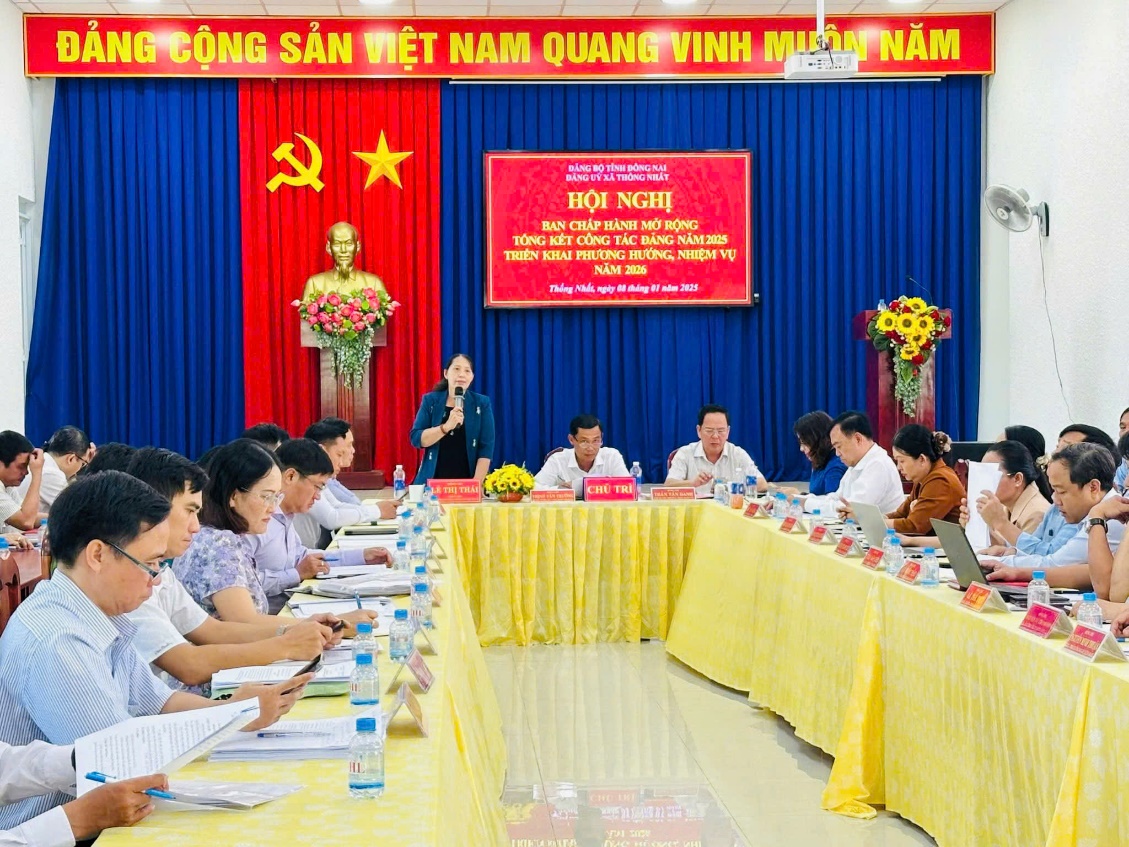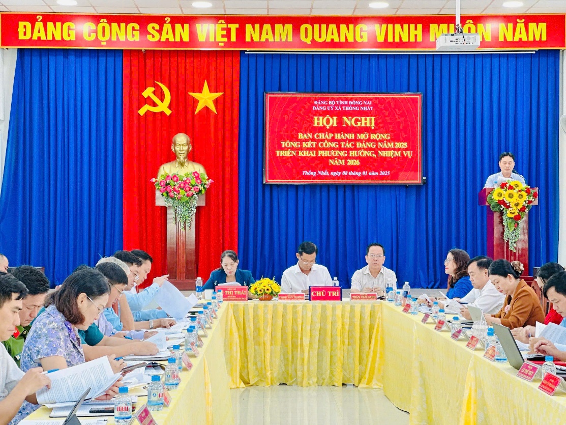 Sáng ngày 8-1, Đảng bộ xã Thống Nhất tổ chức Hội nghị tổng kết công tác xây dựng Đảng năm 2025, triển khai phương hướng, nhiệm vụ năm 2026. Tham dự hội nghị có đồng chí Lê Thị Thái, Tỉnh ủy viên, Phó Trưởng Ban Tuyên giáo và Dân vận Tỉnh ủy; các đồng chí Ủy viên Ban Thường vụ Đảng ủy, Ủy viên Ban Chấp hành Đảng bộ xã; đại diện chi ủy các chi bộ cơ sở, chi bộ và đảng bộ trực thuộc Đảng bộ xã Thống Nhất.
