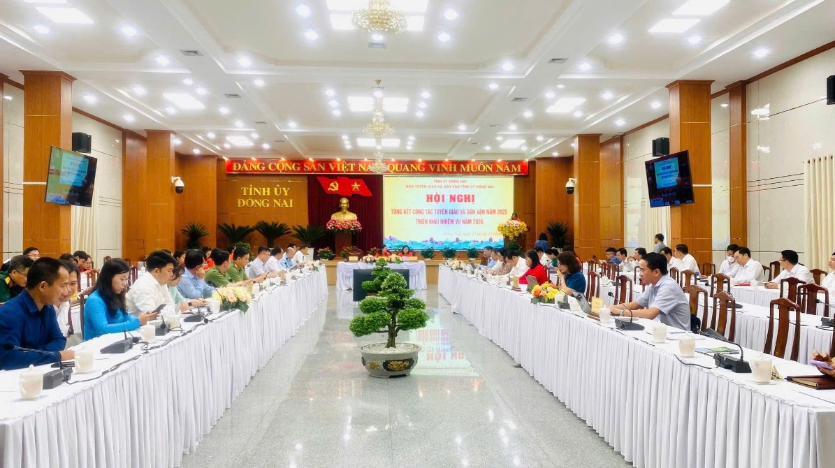 Chiều 23-12, tại Trụ sở Tỉnh ủy, Ban Tuyên giáo và Dân vận Tỉnh ủy Đồng Nai tổ chức Hội nghị Tổng kết công tác tuyên giáo và dân vận năm 2025, triển khai nhiệm vụ năm 2026. Đến tham dự và chỉ đạo Hội nghị có các đồng chí: Nguyễn Công Dẫn, Phó Vụ trưởng Vụ Địa phương 3, Ban Tuyên giáo và Dân vận Trung ương; Huỳnh Thị Hằng, Phó Bí thư Tỉnh ủy, Chủ tịch UBMTTQVN tỉnh; đại diện lãnh đạo UBND tỉnh, các ban Đảng và Văn phòng Tỉnh ủy; các cơ quan, đơn vị của tỉnh; thường trực đảng ủy và ban tuyên giáo và dân vận các đảng ủy trực thuộc tỉnh.