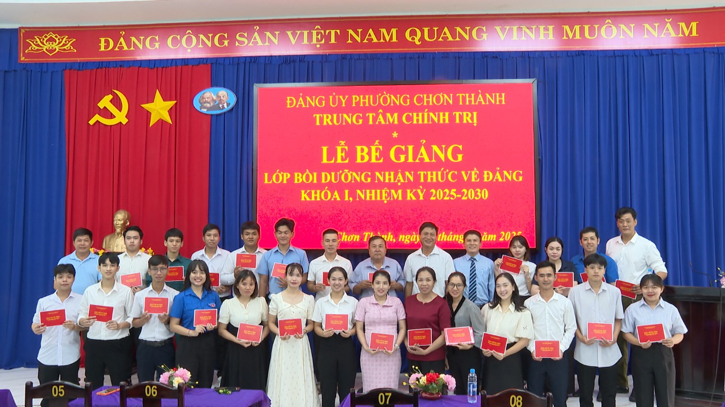 Sáng ngày 26-9-2025, Trung tâm Chính trị phường Chơn Thành, tỉnh đồng Nai đã tổ chức Lễ bế giảng lớp Bồi dưỡng nhận thức về Đảng khoá I, nhiệm kỳ 2025-2030. Tham gia lớp học có 29 quần chúng ưu tú đến từ các Chi bộ, Đảng bộ thuộc: phường Chơn Thành, phường Minh Hưng và xã Nha Bích, tỉnh Đồng Nai.