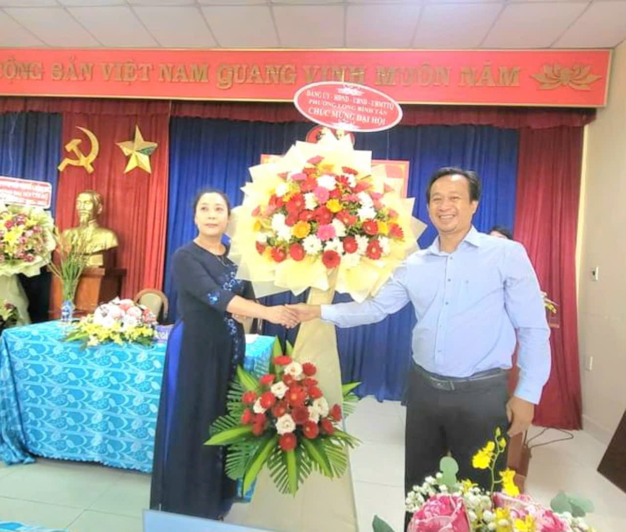 Đại diện Đảng ủy phường Long Bình Tân tặng hoa chúc mừng đồng chí Bí thư và phó Bí thư chi bộ - nhiệm kỳ 2025 - 2027