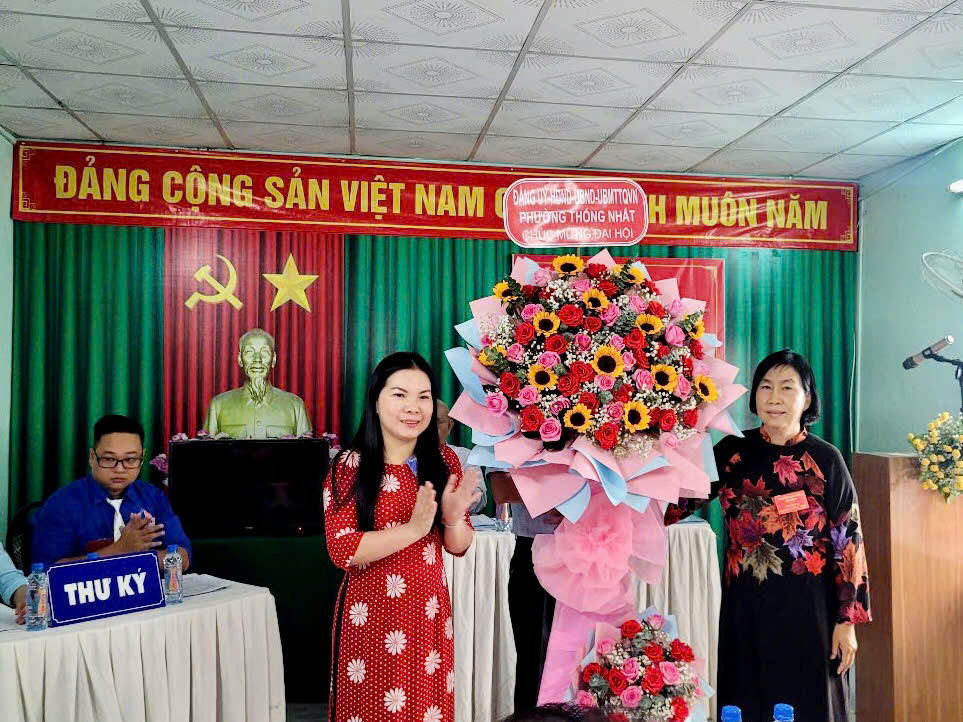 Đồng chí Huỳnh Thị Ngọc Minh, ĐUV – Phó Chủ tịch phường Thống Nhất tặng hoa chúc mừng đại hội