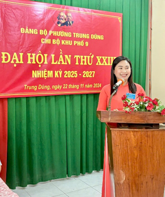 Sáng ngày 22/11/2024, được sự nhất trí của Ban Thường vụ Đảng uỷ, Chi bộ khu phố 9 phường Trung Dũng long trọng tổ chức Đại hội lần thứ XXIII, nhiệm kỳ 2025 - 2027 tại Nhà văn hoá Khu phố 9. Dự và chỉ đạo Đại hội có đồng chí Phan Thị Nga, Bí thư Đảng uỷ; đồng chí Lê Thị Hồng Phượng, Phó Bí thư Đảng uỷ, Chủ tịch HĐND phường; đồng chí Nguyễn Hoàng Thành, Đảng uỷ viên phụ trách chi bộ; bí thư các chi bộ khu phố và đặc biệt là sự hiện diện của 56 đảng viên về tham dự Đại hội.