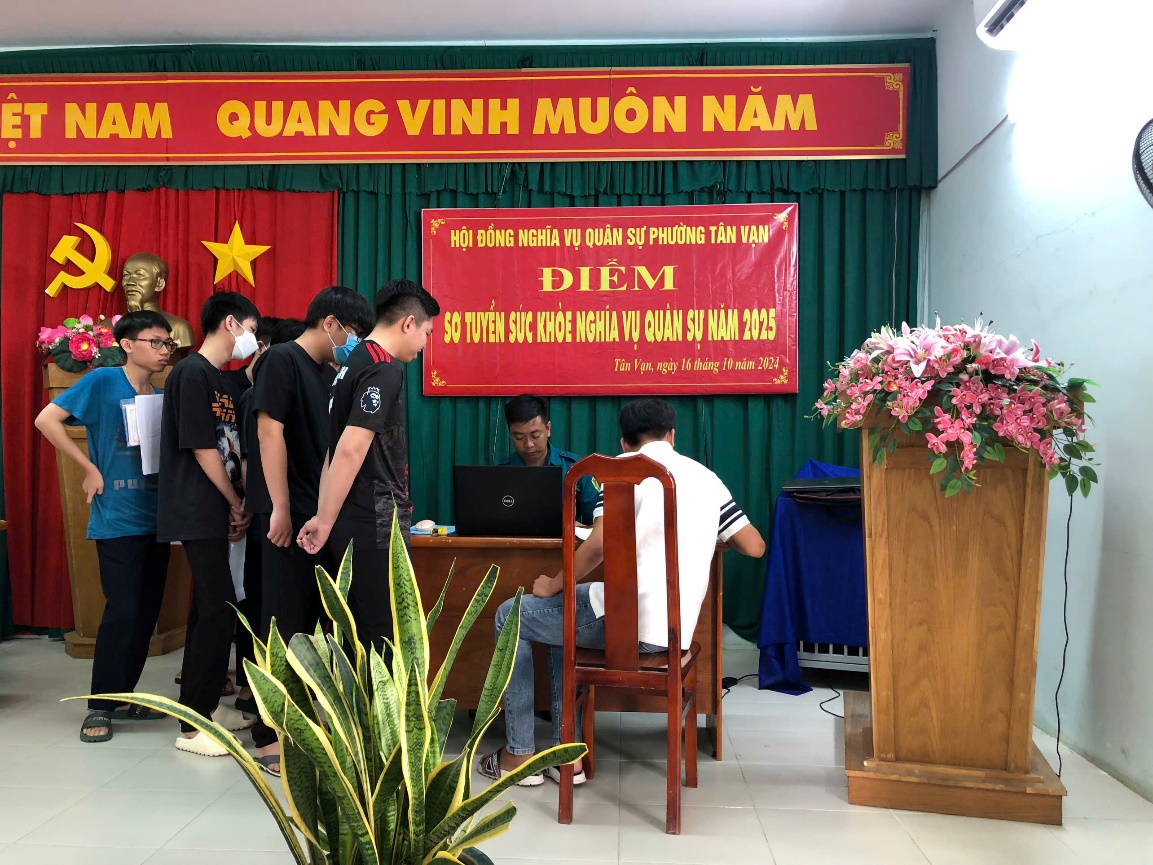 Để đảm bảo công tác tuyển chọn và gọi công dân lên đường nhập ngũ năm 2025. Ngày 12/10/2024, Hội đồng nghĩa vụ quân sự phường Tân Vạn đã triển khai công tác khám sơ tuyển nghĩa vụ quân sự cho các công dân trên địa bàn phường. Qua khám sơ tuyển, nhằm tuyển chọn những công dân có sức khỏe tốt, chuẩn bị sẵn sàng cho công tác tuyển chọn và gọi công dân nhập ngũ theo đúng quy định.