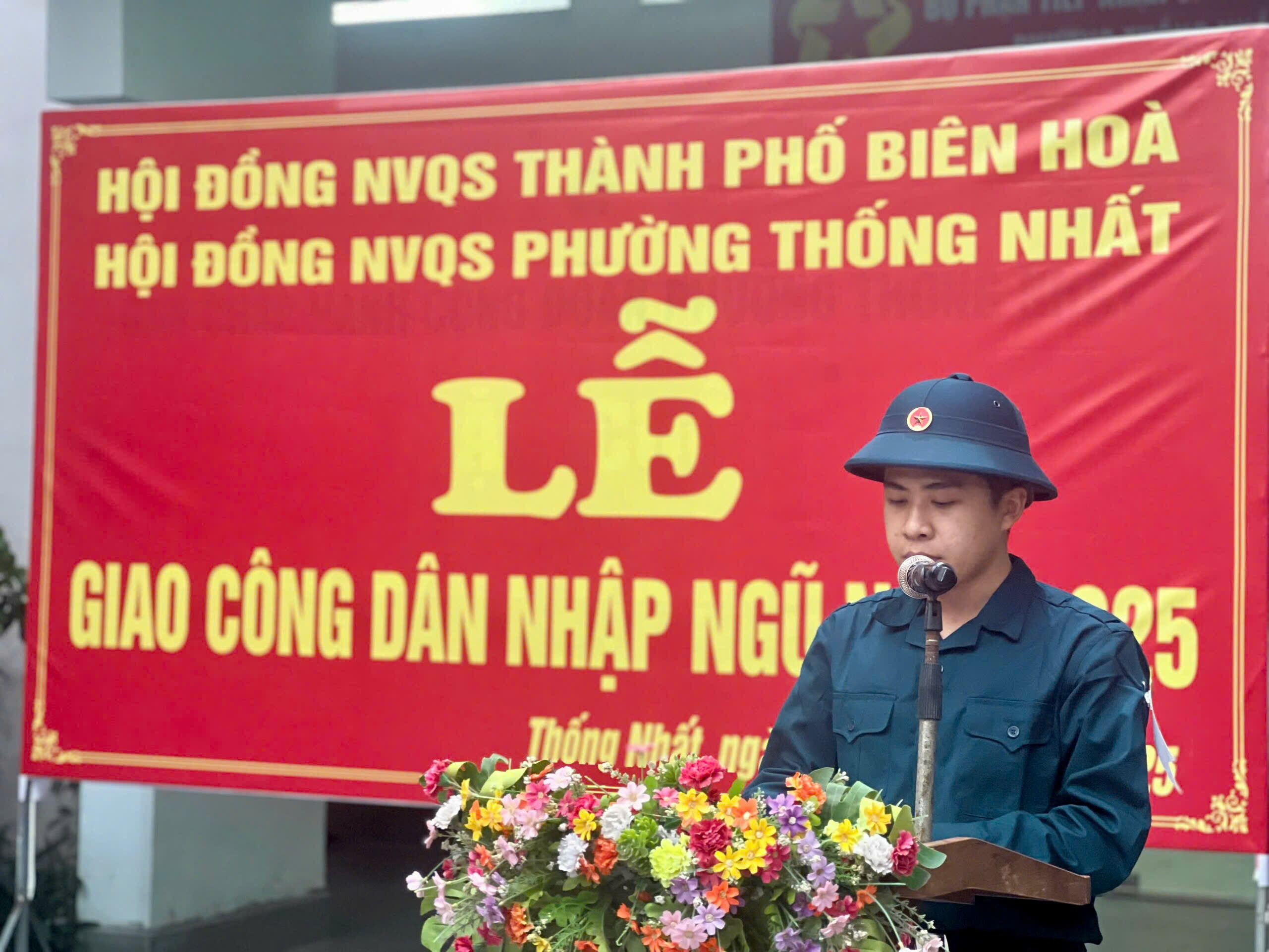 Chiều ngày 11/02/2025, Hội đồng nghĩa vụ quân sự phường Thống Nhất đã tổ chức lễ giao công dân nhập ngũ năm 2025. Đến dự có đồng chí Trương Minh Trung – Bí Thư Đảng ủy phường; đồng chí Đỗ Thị Thùy Trang – Phó Bí thư Đảng ủy – Chủ tịch UBND - Chủ tịch Hội đồng nghĩa vụ Quân sự phường; đồng chí Nguyễn Thị Kim Lê – UVTV/Thường trực Đảng ủy phường; đồng chí Huỳnh Thị Ngọc Minh – Đảng ủy viên – Phó Chủ tịch UBND phường; đồng chí Phan Văn Hải Âu – Đảng ủy viên - Chỉ huy trưởng Ban Chỉ huy Quân sự phường, các ông bà là thành viên Hội đồng Nghĩa vụ quân sự, 18 thanh niên trúng tuyển nghĩa vụ quân sự và gia đình.