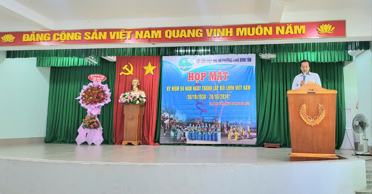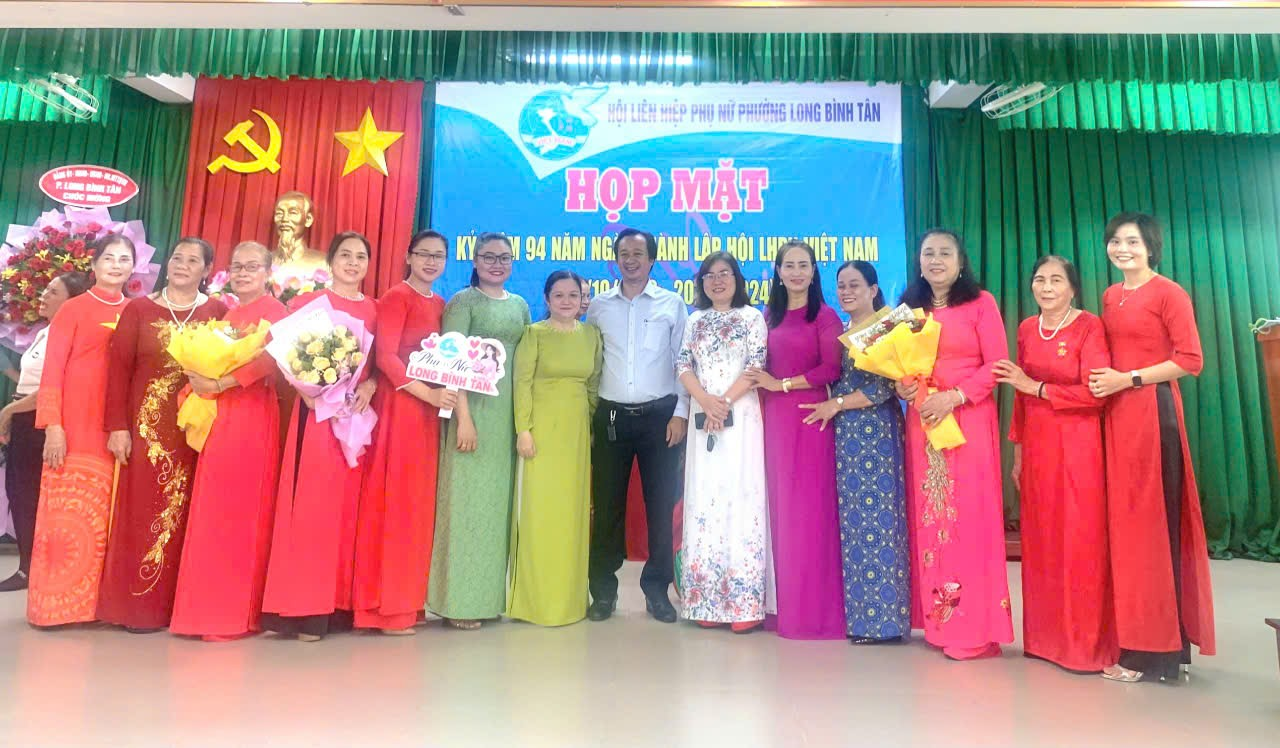 Sáng ngày 19/10/2024, Hội LHPN phường Long Bình Tân tổ chức họp mặt kỷ niệm 94 năm Ngày thành lập Hội LHPN Việt Nam (20/10/1930- 20/10/2024). Tham dự buổi họp mặt có đồng chí Ngô Minh Hải – Phó Bí thư thường trực Đảng ủy phường, các đồng chí là Ủy viên Ban Chấp hành Đảng bộ, lãnh đạo HĐND, UBND, Ủy ban MTTQ Việt Nam, Trưởng, phó các đoàn thể phường, Bí thư các chi đảng bộ trực thuộc và 100 hội viên tham dự.