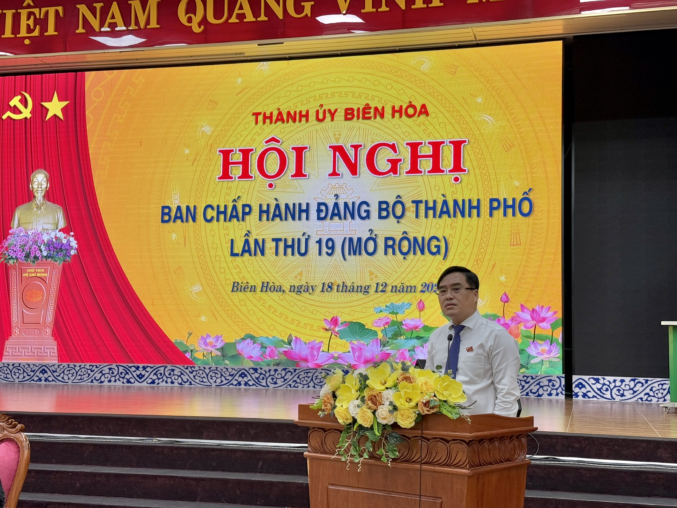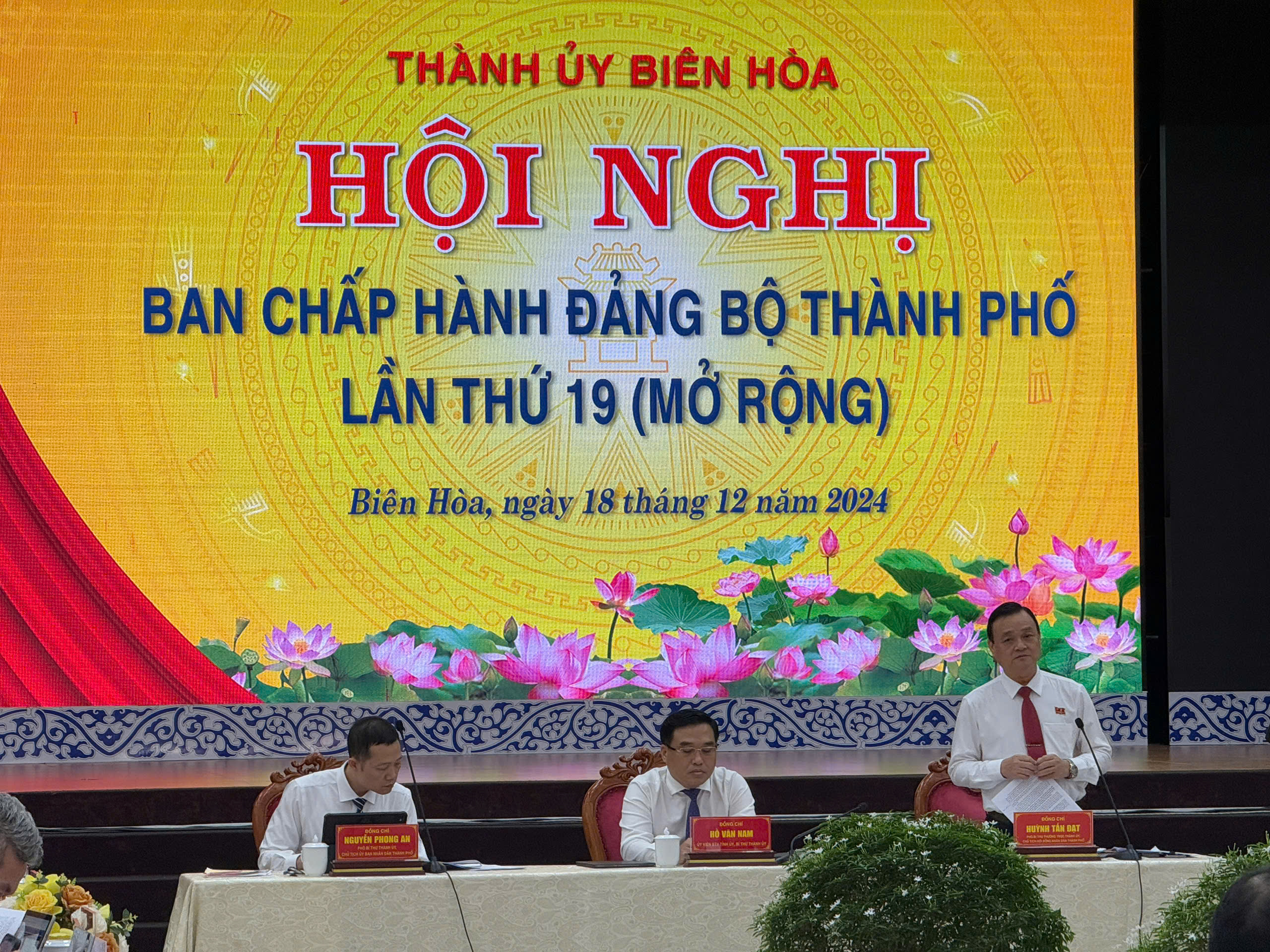 Chiều ngày 18/12/2024, Thành ủy Biên Hòa tổ chức Hội nghị Ban Chấp hành Đảng bộ thành phố lần thứ 19 (mở rộng) nhằm đánh giá kết quả thực hiện Nghị quyết số 14-NQ/TU ngày 18/12/2023 của Thành ủy về mục tiêu, nhiệm vụ năm 2024, đề ra các chỉ tiêu, nhiệm vụ năm 2025 và cho ý kiến một số nội dung thuộc thẩm quyền. Các đồng chí Hồ Văn Nam, Ủy viên Ban Thường vụ Tỉnh ủy – Bí thư Thành ủy; Huỳnh Tấn Đạt, Phó Bí thư Thường trực Thành ủy – Chủ tịch Hội đồng Nhân dân thành phố; Nguyễn Phong An, Phó Bí thư Thành ủy – Chủ tịch Ủy ban Nhân dân thành phố chủ trì Hội nghị.