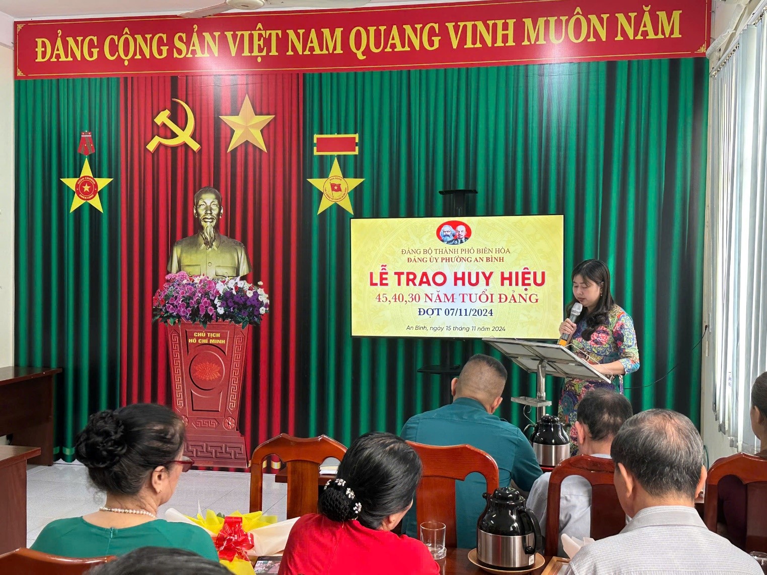 Được sự ủy quyền của Ban Thường vụ Thành ủy, Sáng ngày 15/11/2024 Đảng bộ phường An Bình long trọng tổ chức lễ trao tặng huy hiệu 45, 40, 30 năm tuổi Đảng cho 15 đảng viên thuộc Đảng bộ phường nhân dịp kỷ niệm 107 năm Ngày cách mạng tháng 10 Nga (07/11/1917- 07/11/2024).