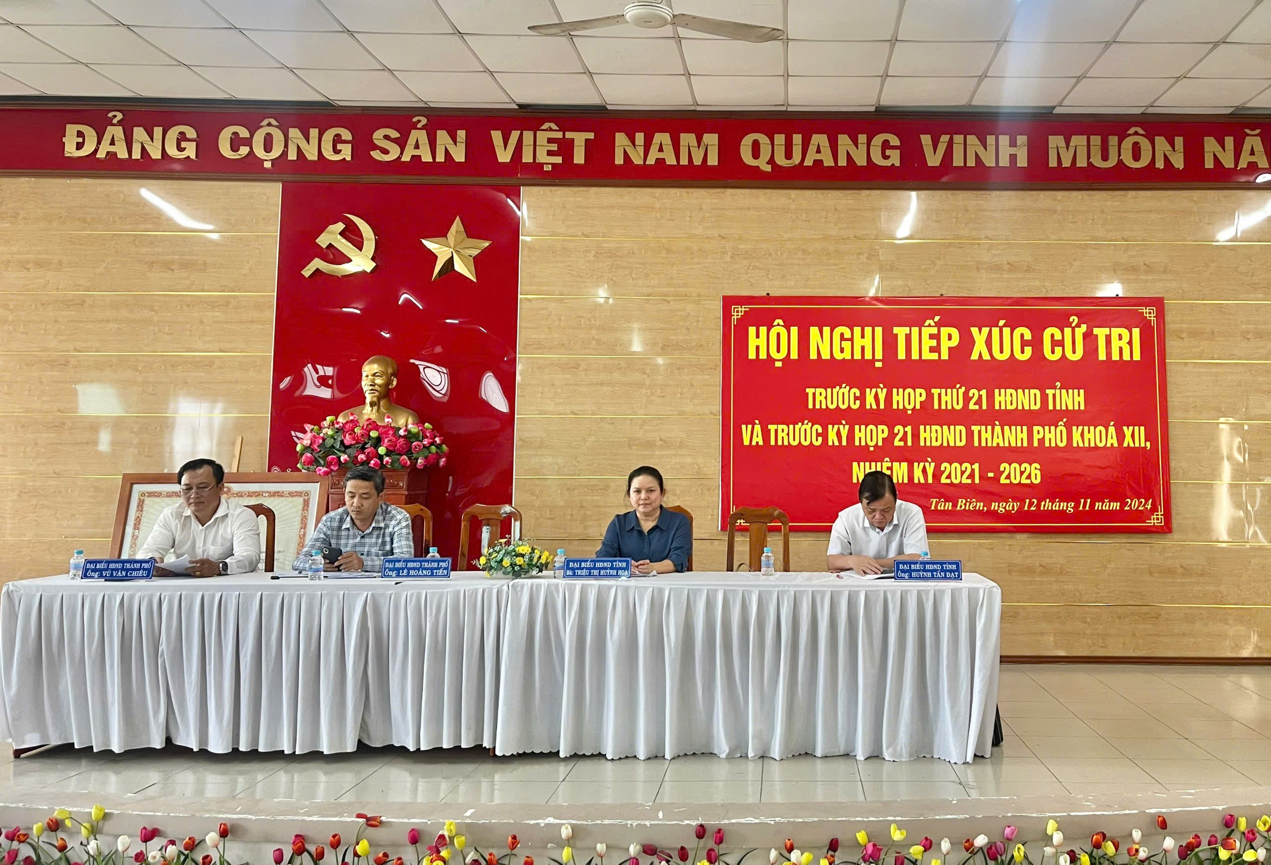 Tại buổi tiếp xúc cử tri, Bà Triệu Thị Huỳnh Hoa đại diện cho Đại biểu HĐND tỉnh thông qua báo cáo kết quả thực hiện nhiệm vụ kinh tế - xã hội, quốc phòng- an ninh năm 2024 của UBND tỉnh và kết quả hoạt động năm 2024 của HĐND tỉnh, thông qua những nội dung chính thuộc chương trình kỳ họp thứ 21 của HĐND tỉnh (kỳ họp thường lệ cuối năm 2024), đại diện HĐND tỉnh đã thông tin tới các cử tri về các chỉ tiêu nổi bật của tỉnh; những dự án, công trình sắp được triển khai trên địa bàn. Cũng tại buổi tiếp xúc cử tri Ông Võ Văn Chiêu, Đại biểu HĐND thành phố thông qua báo cáo kết quả thực hiện nhiệm vụ kinh tế - xã hội, quốc phòng - an ninh năm 2024 của UBND thành phố và kết quả hoạt động năm 2024 của HĐND thành phố và thông qua những nội dung chính thuộc chương trình kỳ họp thứ 21 của HĐND thành phố (kỳ họp thường lệ cuối năm 2024)