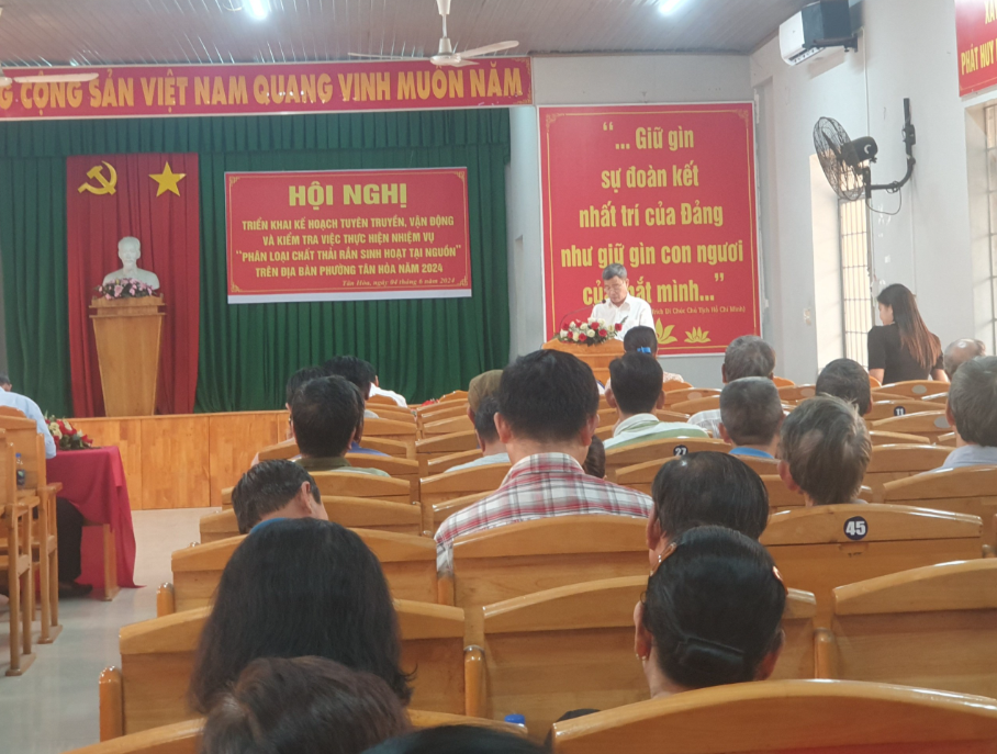 Thực hiện Kế hoạch số 03-KH/BTTVĐ ngày 21/5/2024 của Ban tuyên truyền, vận động thực hiện phân loại chất thải rắn sinh hoạt tại nguồn địa bàn thành phố Biên Hòa về tuyên truyền, vận động và kiểm tra việc thực hiện nhiệm vụ “phân loại chất thải rắn sinh hoạt tại nguồn” trên địa bàn thành phố Biên Hòa năm 2024. Ngày 04-06-2024, Khối dân vận Đảng ủy phường Tân Hòa đã tổ chức Hội nghị triển khai kế hoạch tuyên truyền vận động và kiểm tra việc thực hiện nhiệm vụ “phân loại chất thải rắn sinh hoạt tại nguồn” trên địa bàn phường 2024.
