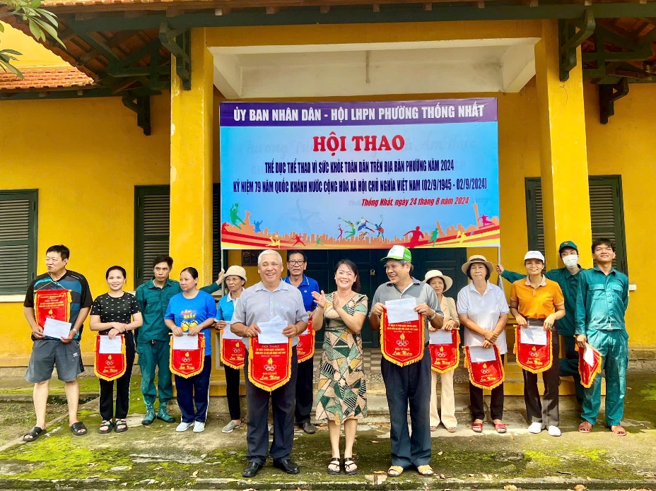 Sáng ngày 24/8, Ủy ban nhân dân phường Thống Nhất và Hội liên hiệp Phụ nữ phường đã phối hợp tổ chức Hội thao, thể dục thể thao vì sức khỏe toàn dân chào mừng kỷ niệm 79 năm Quốc khánh nước Cộng hòa Xã hội Chủ nghĩa Việt Nam (02/9/1945-02/9/2024).
