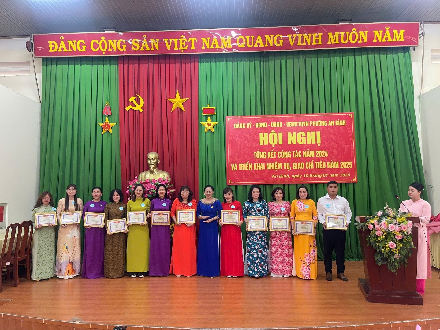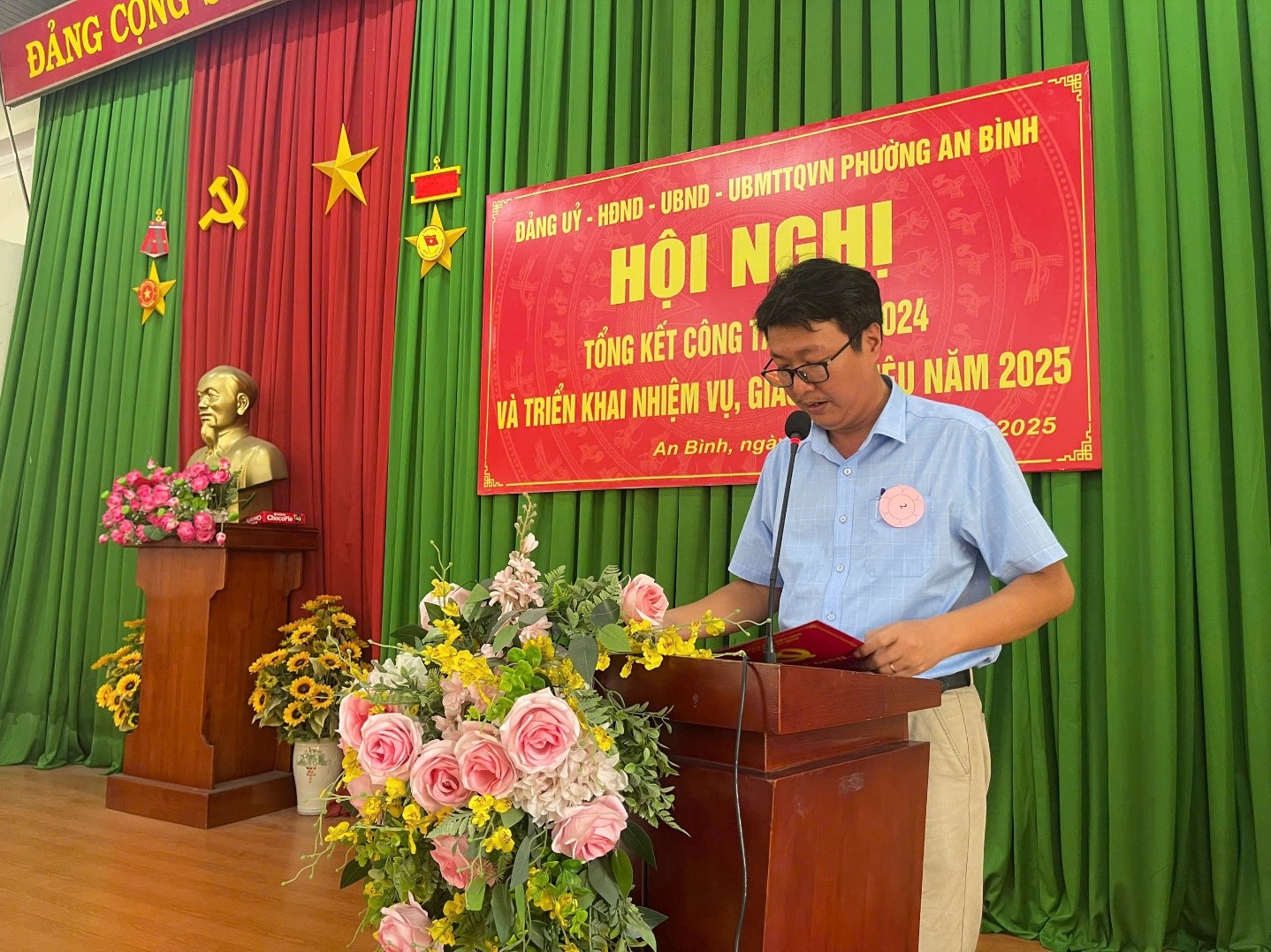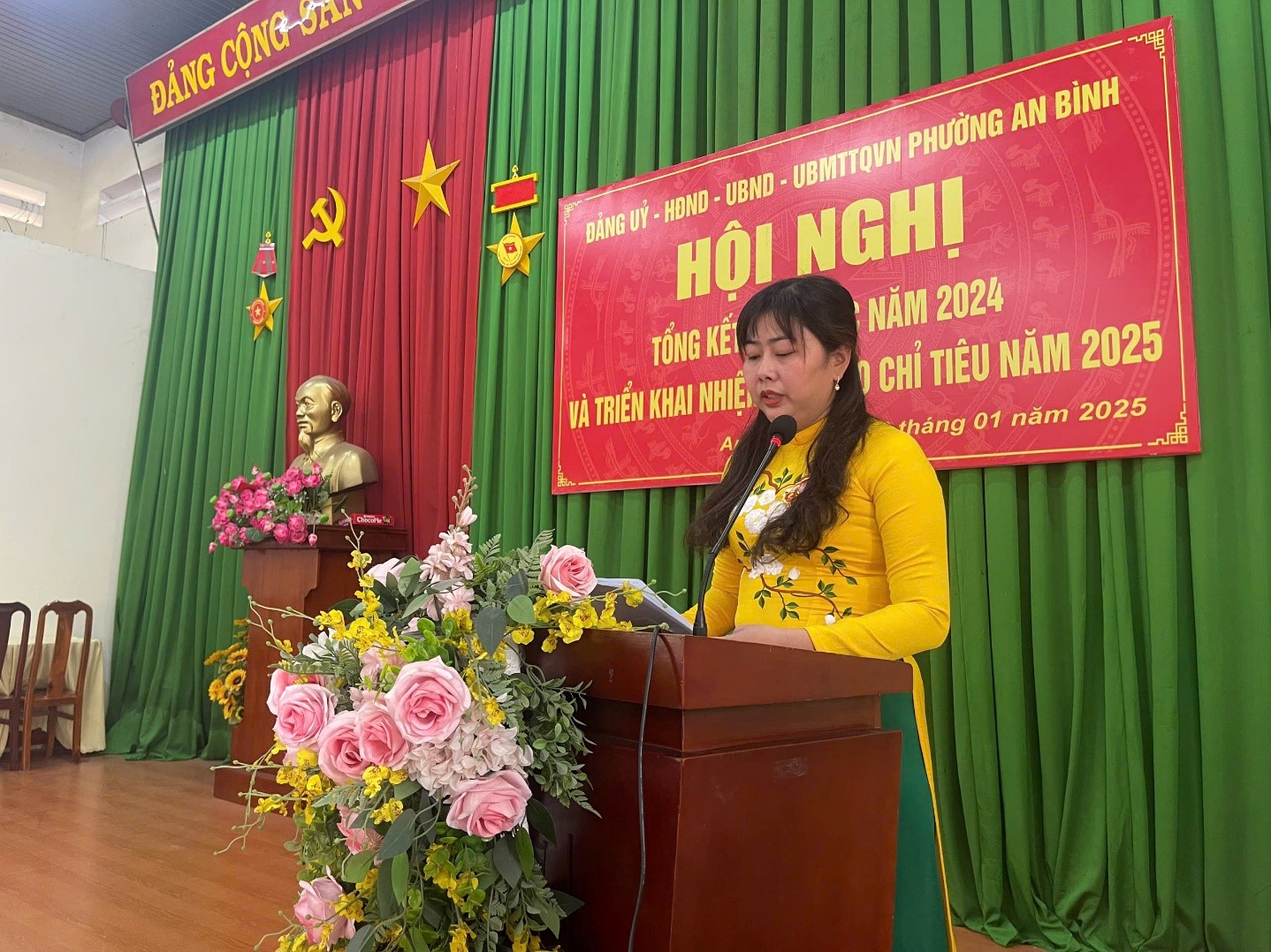 Phát biểu tại Hội nghị đồng chí Lê Thị Mỹ Chi – Bí thư Đảng ủy, Chủ tịch HĐND phường đã chỉ rõ năm 2025 là năm có ý nghĩa đặc biệt quan trọng, là năm cuối thực hiện Kế hoạch phát triển kinh tế - xã hội 5 năm liền (2021-2025), là năm tăng tốc, bức phá, về đích, đồng thời là năm tập trung tổ chức Đại hội Đảng các cấp, tiến tới Đại hội đại biểu toàn quốc lần thứ XIV của Đảng và củng cố, chuẩn bị tốt các yếu tố, nền tẳng để thực hiện thắng lợi Chiến lược phát triển kinh tế - xã hội trong những năm tiếp theo, đánh dấu thời điểm đất nước bước vào kỷ nguyên mới, kỷ nguyên vươn mình, phát triển giàu mạnh, thịnh vượng của dân tộc. Đồng chí mong rằng toàn thể cán bộ, đảng viên, đoàn viên, hội viên và các tầng lớp nhân dân trong phường tăng cường đoàn kết thống nhất hơn nữa, tích cực phát huy những kết quả đạt được, khắc phục tồn tại hạn chế năm 2024, nỗ lực phấn đấu để hoàn thành đạt và vượt những mục tiêu, nhiệm vụ trong năm 2025. Tổ chức và thực hiện tốt các phong trào thi đua, thể hiện tinh thần yêu nước, yêu quê hương An Bình anh hùng nhằm chào mừng những ngày kỷ niệm, ngày lễ lớn của đất nước, của địa phương.