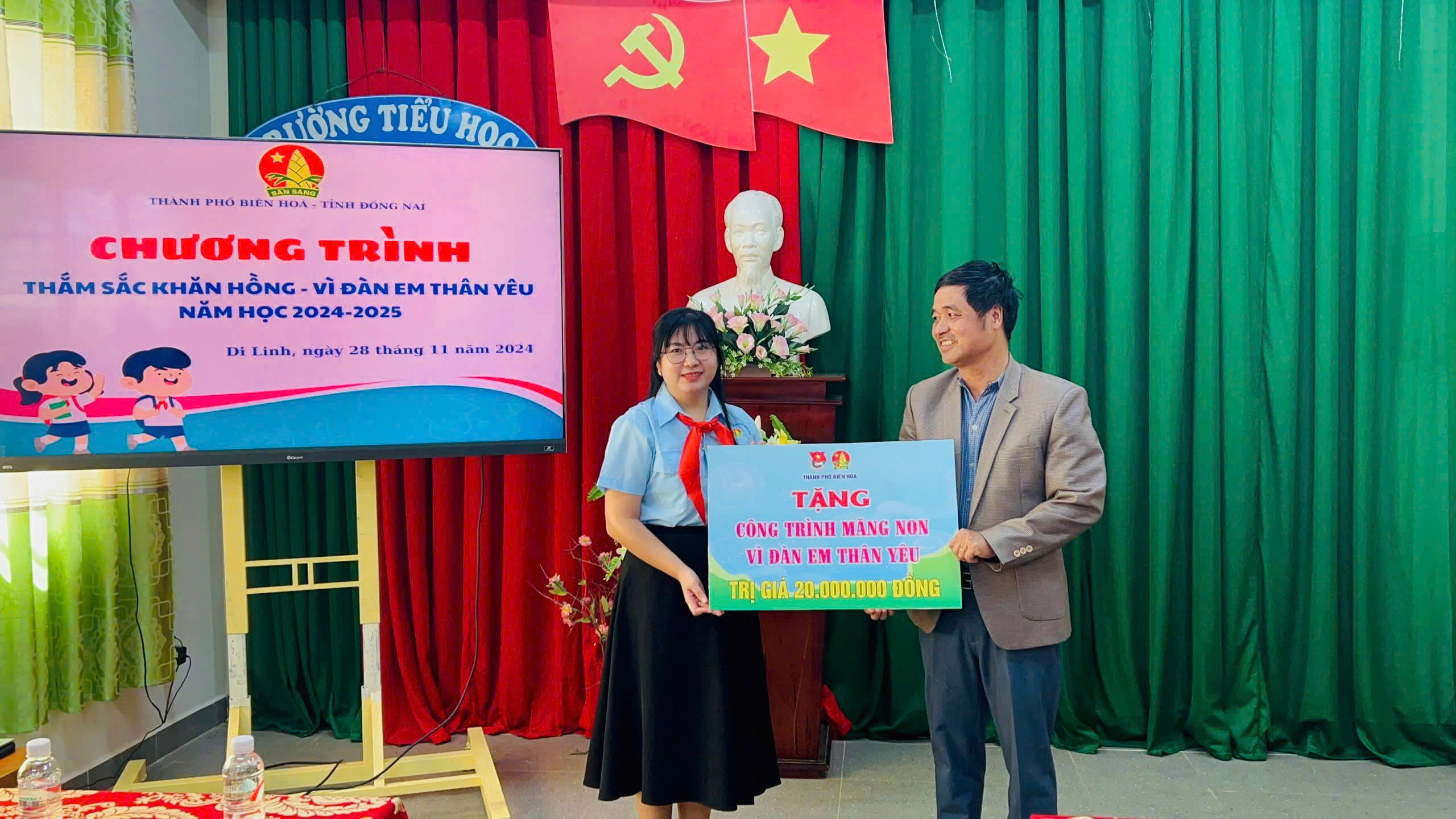 Nhằm thực hiện hiệu quả cuộc vận động “Vì đàn em thân yêu” gắn với các hoạt động tình nguyện “Hỗ trợ thiếu nhi có hoàn cảnh khó khăn”. Ngày 28/11/2024, Hội đồng Đội thành phố cùng Phòng Giáo dục và đào tạo thành phố tổ chức Chương trình Thắm sắc khăn hồng - Vì đàn thân yêu” năm học 2024 – 2025 tại Trường Tiểu học Bảo Thuận, huyện Di Linh, tỉnh Lâm Đồng. Trường Tiểu học Bảo Thuận là một đơn vị có hơn 900 học sinh trong đó 96% thiếu nhi, đội viên là đồng bào dân tộc thiểu số Người K’Ho. Đến thăm và làm việc, Hội đồng Đội thành phố đã trao tặng Công trình măng non trị giá 20 triệu đồng bao gồm 30 phần quà, 01 học bổng cho các em học sinh, thiếu nhi có hoàn cảnh khó khăn trị giá 500.000 đồng và 01 bộ trống đội cho Liên đội Trường Tiểu học Bảo Thuận.