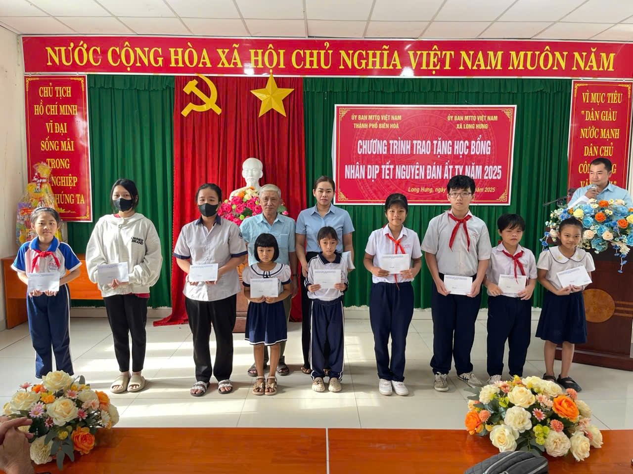 Nhằm khích lệ tinh thần hiếu học của các em học sinh nghèo, học sinh có hoàn cảnh khó khăn trên địa bàn xã Long Hưng, Sáng ngày 15/01/2025 UBMTTQ VN xã Long Hưng phối hợp cùng UBMTTQ TP biên hoà tổ chức lễ trao tặng 22 suất học bổng em học sinh có hoàn cảnh khó khăn trên địa bàn xã, được biết mỗi phần quà trị giá 1 triệu đồng số tiền được trích từ một phần của quỷ vì người nghèo của Ủy ban MTTQ VN thành phố Biên Hòa.