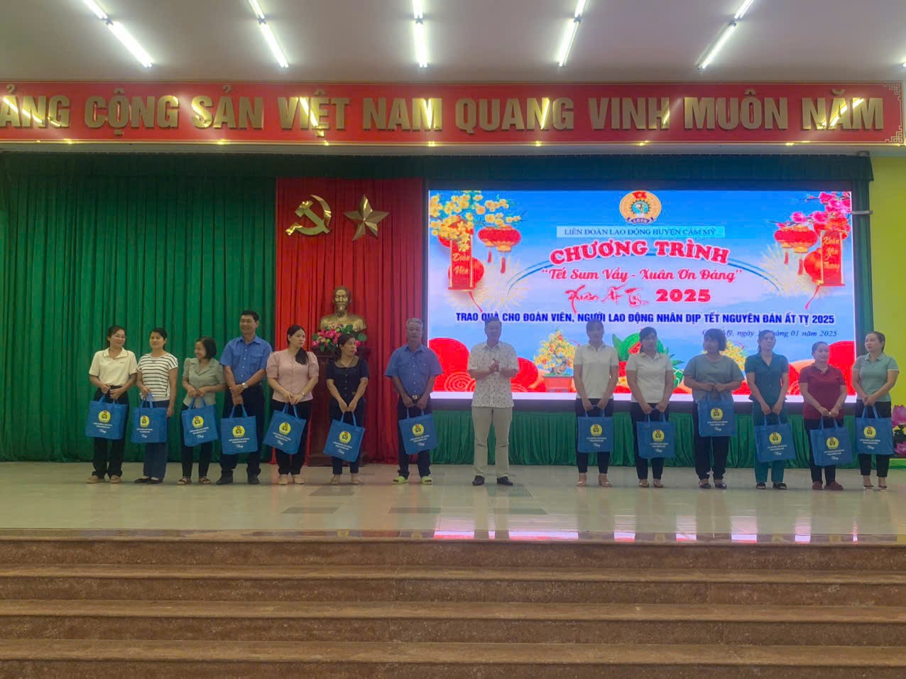Thực hiện các hoạt động chăm lo Tết cho đoàn viên, CNVCLĐ nhân dịp Tết nguyên đán Ất Tỵ năm 2025. Sáng ngày 15 tháng 01 năm 2025, tại hội trường Trung tâm chính trị huyện, Liên đoàn lao động huyện Cẩm Mỹ tổ chức Chương trình “Tết sum vầy, xuân ơn Đảng” và trao quà cho đoàn viên, CNVCLĐ bị bệnh hiểm nghèo, CNVCLĐ có hoàn cảnh khó khăn. Tham dự chương trình có đồng chí Lưu Văn Sửu – Phó Bí thư Huyện uỷ - Chủ tịch HĐND huyện; đồng chí Nguyễn Văn Hùng – UVTV - Trưởng Ban Dân vận Huyện uỷ; lãnh đạo MTTQ và các đoàn thể huyện; các đồng chí trong BCH LĐLĐ huyện; chủ tịch, phó chủ tịch các CĐCS trực thuộc, Đài truyền thanh huyện và 360 đoàn viên, CNVCLĐ bị bệnh hiểm nghèo, CNVCLĐ có hoàn cảnh khó khăn.