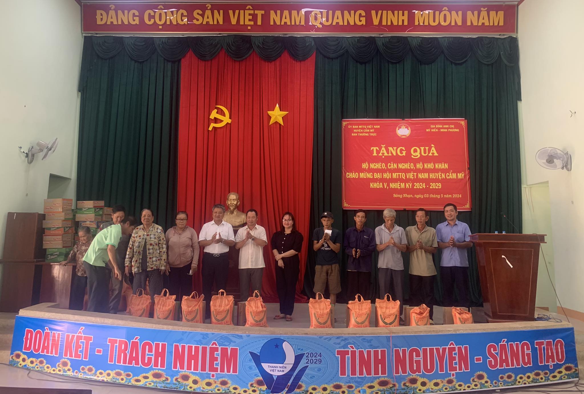 Hướng tới chào mừng Đại hội MTTQ các cấp, Đại hội Mặt trận Tổ quốc Việt Nam huyện Cẩm Mỹ, nhiệm kỳ 2024-2029. Sáng ngày 3/5/2024, MTTQ huyện vận động Hội Từ thiện TP.HCM trao tặng 10 triệu đồng mua BHYT cho các hộ khó khăn tại thị trấn Long Giao, Hội Từ thiện tỉnh Đồng Nai trao tặng 100 phần quà trị giá 50 triệu đồng cho hộ nghèo, cận nghèo, hộ khó khăn tại thị trấn Long Giao; mạnh thường quân Gia đình anh chị Minh Phương – Mỹ Hiền trao tặng 100 phần quà trị giá 50 triệu đồng cho hộ nghèo, cận nghèo, hộ khó khăn xã Sông Nhạn, Thừa Đức