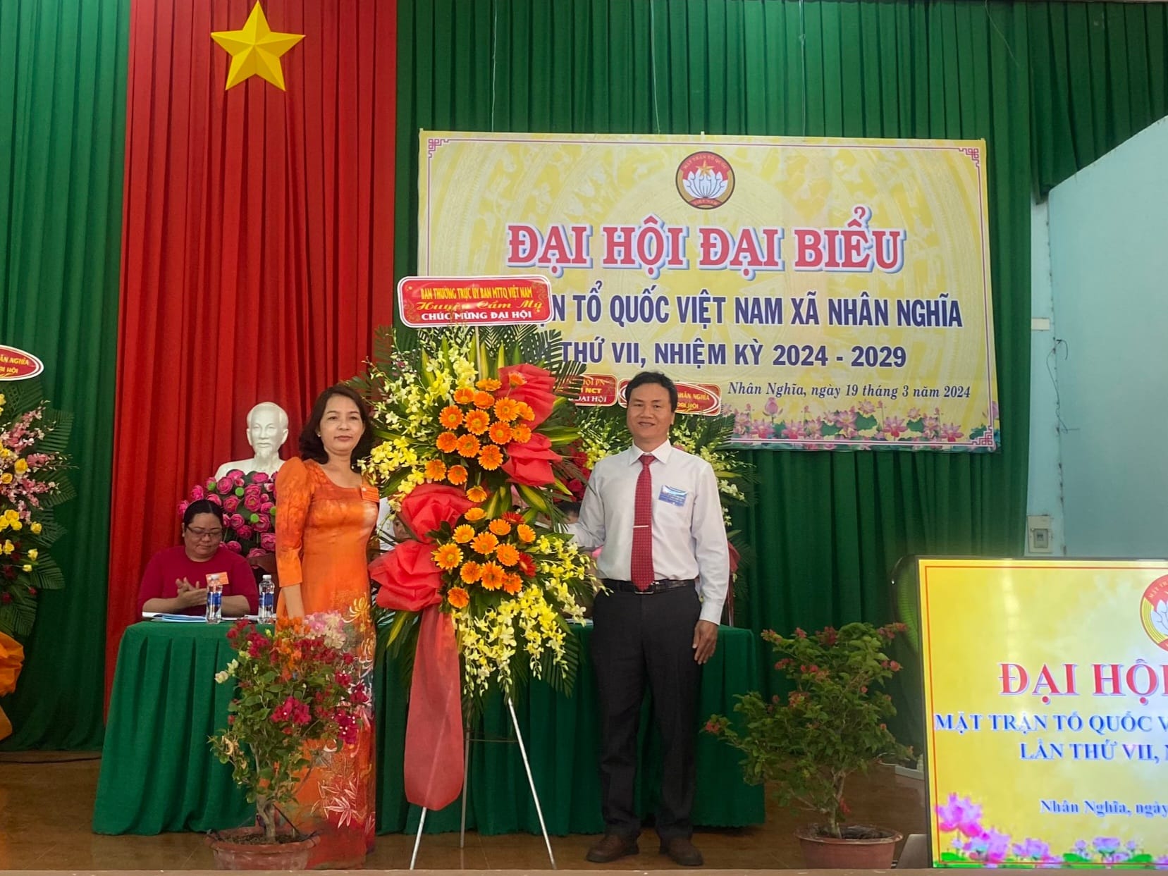 Lãnh đạo MTTQ Việt Nam huyện tặng hoa chúc mừng thành công Đại hội MTTQ Việt Nam xã Nhân Nghĩa