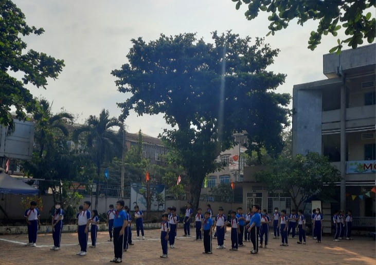 Tiết học thể dục của học sinh Trường Tiểu học Nguyễn Du, (phường Quyết Thắng, thành phố Biên Hòa)