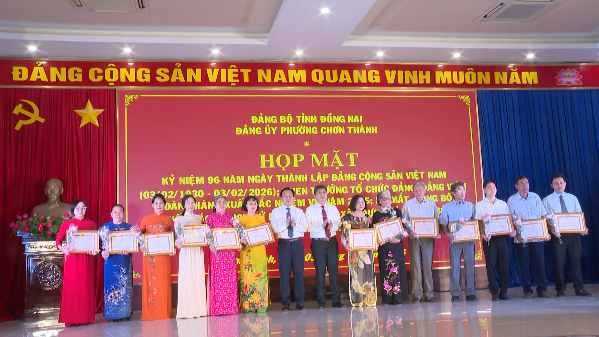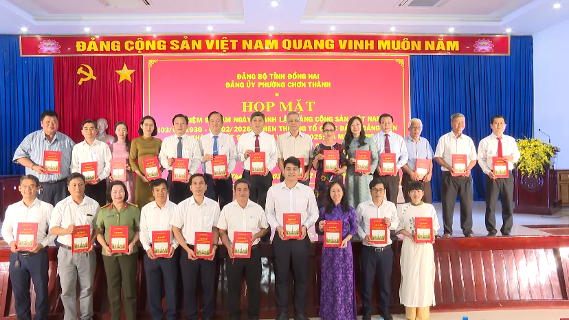 (CTT-Đồng Nai) - Ngày 3-2 Đảng ủy phường Chơn Thành đã tổ chức hội nghị họp mặt kỷ niệm 96 năm Ngày thành lập Đảng Cộng sản Việt Nam; Khen thưởng tổ chức đảng, đảng viên hoàn thành xuất sắc nhiệm vụ năm 2025 và ra mắt, công bố cuốn sách “Lịch sử đấu tranh và xây dựng của Đảng bộ, Quân và Dân Chơn Thành ( 1930-2025).