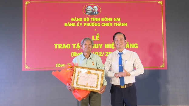 Bí thư Đảng ủy phường Chơn Thành Nguyễn Minh Bình, trao Quyết định của Tỉnh ủy và gắn Huy hiệu Đảng cho các đảng viên có nhiều năm cống hiến trong sự nghiệp cách mạng của Đảng