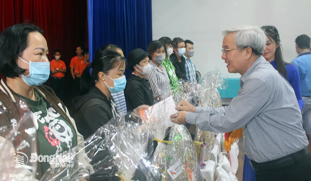 Đ/c Cao Văn Quang, UVTV, Chủ tịch Ủy ban MTTQ Việt Nam tỉnh tặng quà công nhân khó khăn dịp Tết năm 2023 (ảnh Báo Đồng Nai)