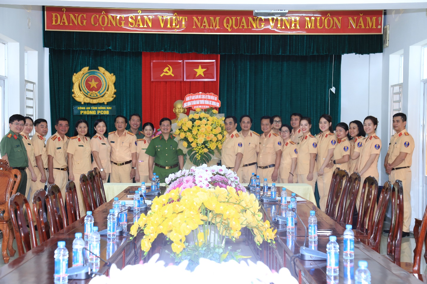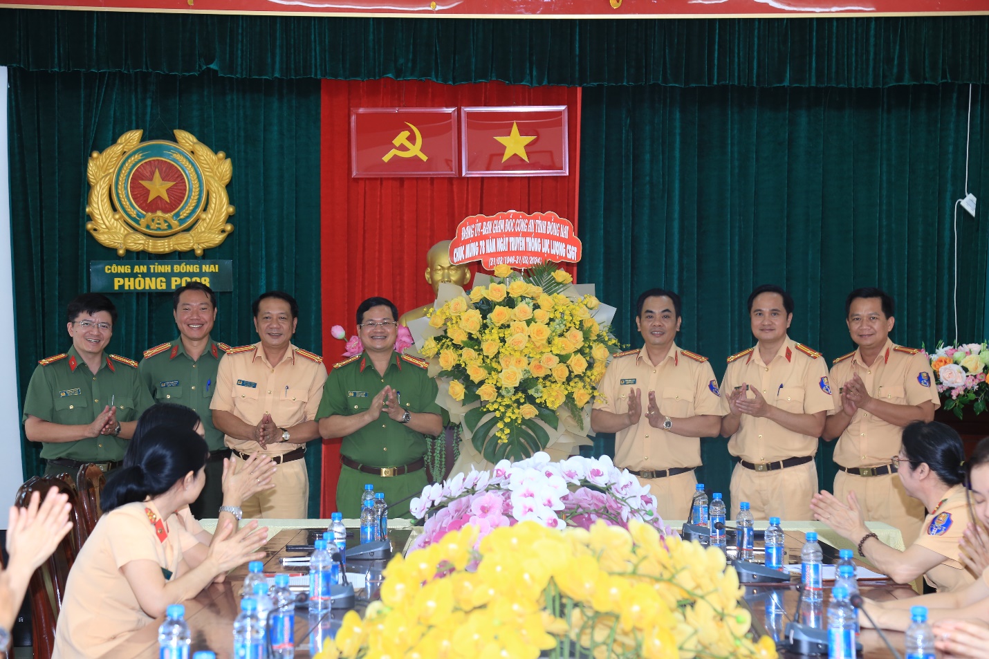 Đại tá Trần Anh Sơn tặng lẵng hoa tươi thắm chúc mừng tập thể CBCS Phòng Cảnh sát giao thông