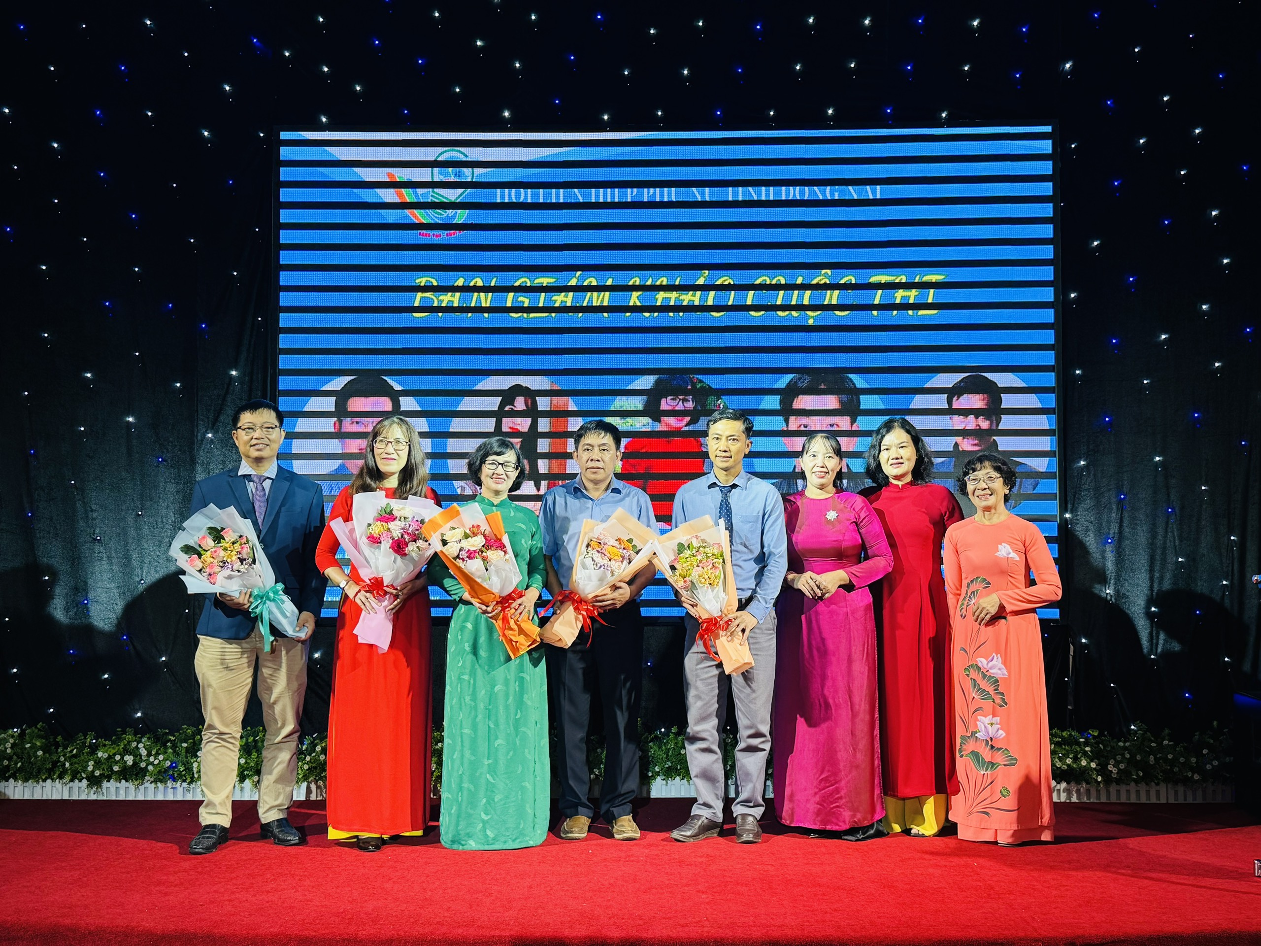 Đ/c Lê Thị Thái – TUV, Chủ tịch Hội LHPN tỉnh (thứ 3 từ phải qua) và các đại biểu tham dự tặng hoa cho Ban Giám khảo Cuộc thi