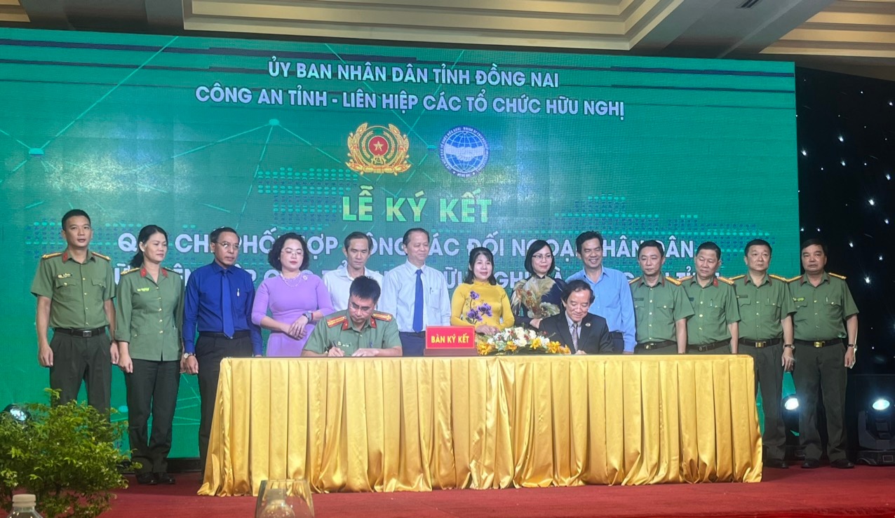 Lãnh đạo Công an tỉnh và Liên hiệp các tổ chức hữu nghị tỉnh Đồng Nai thực hiện nghi thức ký kết Quy chế phối hợp công tác đối ngoại nhân dân