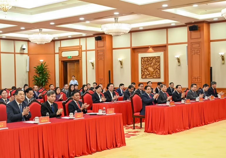 Thủ tướng Phạm Minh Chính, Thường trực Ban Bí thư Trần Cẩm Tú cùng các đồng chí lãnh đạo Đảng, Nhà nước dự hội nghị. (Ảnh: Duy Linh)