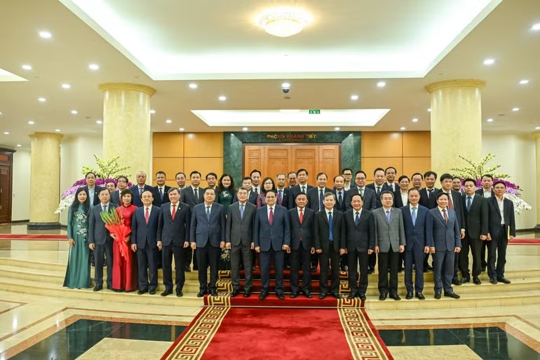 Thủ tướng Phạm Minh Chính, Thường trực Ban Bí thư Trần Cẩm Tú cùng các đồng chí lãnh đạo Đảng, Nhà nước với lãnh đạo các cơ quan. (Ảnh: Duy Linh)