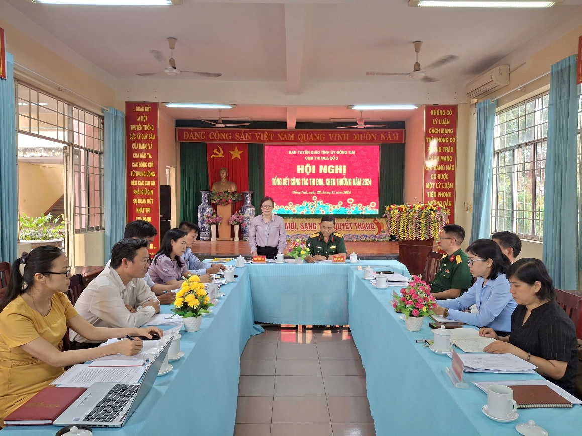 Chiều ngày 26/11/2024, tại phòng họp Bộ Chỉ huy Quân sự tỉnh, Cụm thi đua số 3 ngành Tuyên giáo tổ chức họp bình xét thi đua - khen thưởng năm 2024. Đến tham dự và chủ trì Hội nghị có các đồng chí: Nguyễn Thị Hồng Trang, TUV, Phó Trưởng ban Thường trực Ban Tuyên giáo Tỉnh ủy; Đại tá Nguyễn Danh Trang, Chủ nhiệm Chính trị, Bộ Chỉ huy Quân sự tỉnh. Cùng tham gia có đại diện lãnh đạo các phòng chuyên môn và chuyên viên Ban Tuyên giáo Tỉnh ủy; lãnh đạo Ban Tuyên giáo các đơn vị trong Cụm thi đua số 3, gồm: Đảng ủy Khối các cơ quan tỉnh; Đảng ủy Khối Doanh nghiệp tỉnh; Đảng ủy Tổng Công ty Cao su Đồng Nai; Phòng Công tác Đảng và công tác chính trị - Công an tỉnh; Phòng Chính trị - Bộ Chỉ huy Quân sự tỉnh.