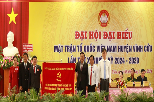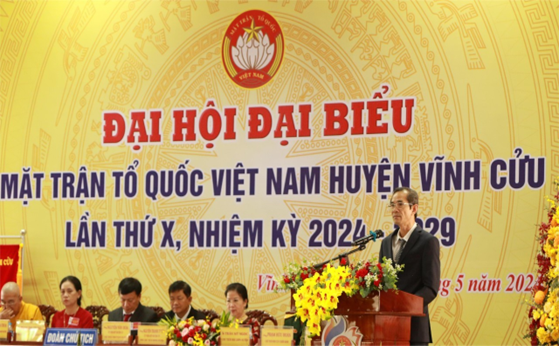 Trong 02 ngày 08/5 và 09/5/2024, Ủy ban MTTQVN huyện Vĩnh Cửu tổ chức Đại hội đại biểu lần thứ X, nhiệm kỳ 2024-2029. Đây là đơn vị được Ban Thường trực Ủy ban MTTQVN tỉnh chọn tổ chức Đại hội điểm cấp huyện. Tham dự Đại hội có các đồng chí: Võ Văn Thiện - Trưởng Ban công tác Mặt trận phía Nam; Nguyễn Thị Vẹn, Phó Ban Dân vận Tỉnh ủy; Nguyễn Cao Tài, Phó Văn phòng Tỉnh ủy; Nguyễn Tất Độ, Phó Chủ tịch Ủy ban MTTQVN tỉnh, Nguyễn Văn Thuộc - TUV, Bí thư Huyện ủy; Nguyễn Tấn Phước - Phó Bí thư Thường trực Huyện ủy; Nguyễn Quang Phương - Phó BTHU, Chủ tịch UBND huyện; Lê Đỗ Kim Chi - UVTV HU, Chủ nhiệm Ủy ban Kiểm tra Huyện ủy, Chủ tịch HĐND huyện cùng lãnh đạo Huyện ủy, HĐND, UBND huyện Vĩnh Cửu và gần 170 đại biểu đại diện cho khối đại đoàn kết toàn dân tộc trên địa bàn huyện Vĩnh Cửu.